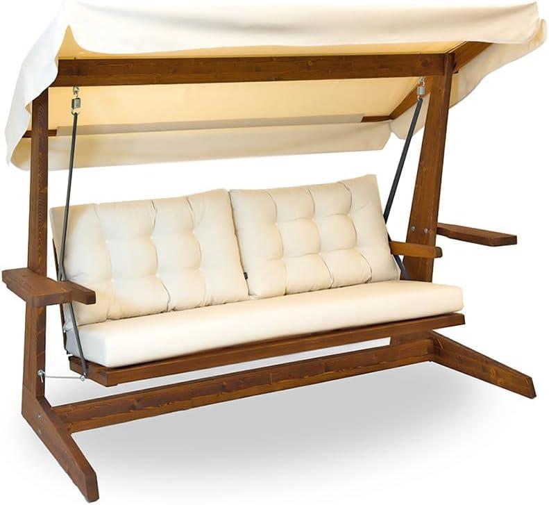 Westmann Holz Hollywoodschaukel Viva 2400 | Beige | 237x115x175 cm Style trifft auf einladende Gemütlichkeit: Die Westmann Hollywoodschaukel Viva 2400 ist aus robustem Massivholz gefertigt und punktet mit einer modernen Konstruktion sowie bequemen Polstern. Mit der ansprechenden Hollywoodschaukel setzt du einen gekonnten Akzent in deinem Garten! Die Highlights auf einen Blick: * Modernes Design: Optisch ansprechende & stabile Konstruktion * Nordisches Fichtenholz: Langlebig und umweltfreundlich | FSC®-zertifiziert * Langlebiger Holzschutz durch 2 Schichten Holzschutzfarbe (Tauchverfahren). * Pflegeleichter & widerstandsfähiger Stoff: Wasser- & schmutzabweisender Polyester | 240 g/m² | UV-Schutz 80 + * Kissenbezug und Sonnendach sind bei 30° waschbar * Robustes Hauptaufhängungs- und Trägermaterial: Metallteile sind pulverbeschichtet * Maximale Traglast von 300 kg | 3 Personen * Schaukelmodul kann fixiert werden Design. Nachhaltigkeit. Qualität! Ein ansprechendes Design alleine macht noch kein perfektes Produkt — deshalb punktet die Hollywoodschaukel Viva 2400 neben der ansprechenden Optik mit weiteren Benefits: Das Holz ist FSC®-zertifiziert und zeichnet sich durch eine hervorragende Umweltbilanz sowie beeindruckende Langlebigkeit aus. Der Polyesterstoff ist wasser- sowie schmutzabweisend und bietet mit einem UV-Schutzfaktor von 80 + ausreichend Schutz vor schädlichen UV-Strahlen. Dank der zweifachen Schicht Holzschutzfarbe auf Wasserbasis ist das Holz zusätzlich vor Witterungseinflüssen geschützt. Dein neuer Lieblingsplatz im Freien! Nimm Platz auf deinem neuen Lieblingsmöbel, schließ die Augen und lass dich sanft hin- und herschaukeln. Mit der Hollywoodschaukel Viva 2400 von Westmann wertest du deinen Garten auf und kannst gleichzeitig entspannte Stunden im Freien genießen!