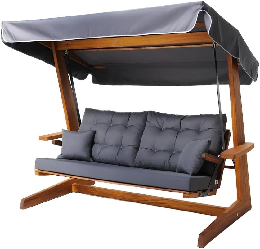 Die Westmann Holz Hollywoodschaukel Sia 2400 in Anthrazit vereint Qualität, Komfort und Ästhetik. Gefertigt aus massivem afrikanischem Iroko-Holz und behandelt mit speziellem Teaköl, bietet sie eine stufenweise verstellbare Rückenlehne für optimale Entspannung. Mit Platz für bis zu 3 Personen (max. 400 kg) und seitlichen Ablagetischen ist sie ideal für den Garten oder die Terrasse. Die robuste Polsterung aus Outdoor-Gewebe ist resistent gegen UV-Strahlen, Feuchtigkeit und Schmutz. **Highlights** - Konstruktion aus exotischem und massivem Iroko-Holz - Verstellbare Rückenlehne für optimale Entspannung - Platz für bis zu 3 Personen (max. 400 kg) - Robuste und pflegeleichte Polsterung aus Outdoor-Gewebe - Moderner und hochwertiger Look **Produkteigenschaften** - Abmessungen: 120 x 236 x 190 cm (HxBxT) - Farbe: Anthrazit - Material: Iroko-Holz, Teaköl, Outdoor-Gewebe - Verstellbare Rückenlehne in 5 Stufen - Seitliche Ablagetische und Armlehnen **Lieferumfang** - 1x Schaukelgestell - 1x Sonnendach - 1x Sitzpolster - 2x Rückenpolster - 2x Kissen