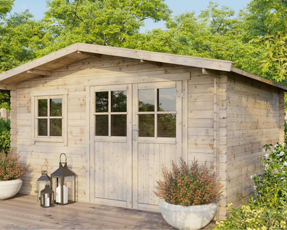Gartenhaus Como im Überblick - Außenmaß: 400x300 cm (Breite x Tiefe) - Sockelmaß: 380x280 cm - Dachüberstand ca. 30 cm - Seitenwandhöhe: ca. 187 cm - Durchgangshöhe Tür: ca. 170cm - Gesamthöhe: 226 cm - Nutzfläche: ca. 10,27 m² - Umbauter Raum: ca. 20,5 m³ - Wandstärke: 28 mm - Durchgangshöhe Tür: ca. 170 cm - Material: Kammergetrocknete nordische Fichte - Farbe: naturbelassen Versand und Verpackung - 1 Packstück - Packmaß: 430 x 125 x 50 cm - Gewicht ca. 580 kg - Anlieferung mit Sattelzug (40-Tonner) und Stapler