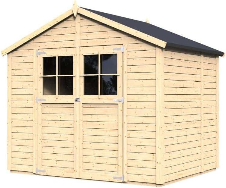 Alpholz Gerätehaus Osterbek ist ein robustes Gartenhaus aus Fichte mit einer Wandstärke von 19 mm. Die stabile Holzrahmenbauweise ermöglicht eine einfache Montage und bietet ein modernes Design. Mit einem Außenmaß von 259x187 cm und einer Fläche von ca. 4,31 m² bietet es ausreichend Stauraum für Ihre Gartenutensilien. Das Gerätehaus verfügt über eine hochwertige Doppeltür und eine Dachlast von max. 85 kg/m². **Highlights** - Einfache Montage: Schneller Aufbau durch vorgefertigte Elemente - Stabile Konstruktion: Hohe statische Belastbarkeit durch Elementbauweise - Modernes Design: Ästhetische Gestaltung für Ihren Garten - Hochwertige Doppeltür: Mit Sicherheitsüberwurf für zusätzlichen Schutz - Inkl. Dachpappe: Zur Ersteindeckung des Daches **Produkteigenschaften** - Außenmaß: 259x187 cm - Sockelmaß: 239x177 cm - Fläche: ca. 4,31 m² - Dachfläche: ca. 5,21 m² - Rauminhalt: 8,34 m³ - Dachüberstand: vorne 5 cm, seitlich 10 cm, hinten 5 cm - Packmaße: 177 x 117 x 48 cm - Gewicht: 260 kg - Dachlast max.: 85 kg/m² - Dachneigung: 30° - Gesamthöhe: 223 cm - Wandstärke: 19 mm - Material: Fichte **Lieferumfang** - 19 mm Massivholzfußboden als Element ohne Fundamenthölzer - Massivholzdach aus 12 mm Multifunktionsplatten-Elementen - Montagematerial & Aufbauplan - Dachpappe zur Ersteindeckung - Lieferung in natur (ohne Farbbehandlung)