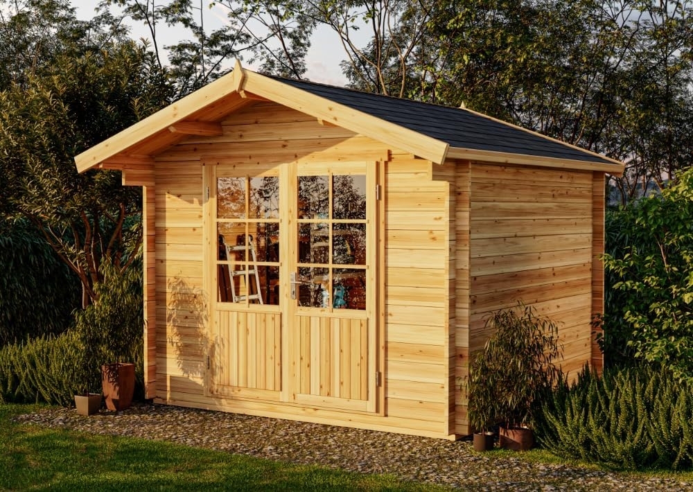 Alpholz Garten- und Gerätehaus Roger-34 ist ein stilvolles Holzhaus in Braun mit einer Wandstärke von 34 mm. Es bietet eine großzügige Grundfläche von 8 m² und einen Rauminhalt von 19,7 m³. Die große Doppel-Eingangstür (ca. 160x188 cm) und das schlichte Design machen es zu einem idealen Ort für Ihre Gartenutensilien. Das Gartenhaus wird mit Montagematerial geliefert und ist ab Werk imprägniert. **Highlights** - Wandstärke: 34 mm für hohe Stabilität - Große Doppel-Eingangstür für einfachen Zugang - Imprägnierung ab Werk in Pinie/Kiefer - Massivholzdach aus Nut- und Federbrettern - Seitenverkehrte Montage möglich **Produkteigenschaften** - Außenmaß: 300x300 cm - Sockelmaß: 280x280 cm - Dachfläche: ca. 11,5 m² - Dachneigung: 19° - Seitenwandhöhe: ca. 203 cm - Gesamthöhe: ca. 252 cm - Grundfläche: 8 m² - Rauminhalt: 19,7 m³ - Verglasung bei Türen & Fenster aus Echtglas - Lieferung ohne Dachpappe und Fußboden **Lieferumfang** - Montagematerial - Massivholzdach aus Nut- und Federbrettern - Verglasung bei Türen & Fenster aus Echtglas - Sturmleisten für Windsicherung - Schloss und Drückergarnitur - Lieferung ohne Dachpappe - Lieferung ohne Fußboden