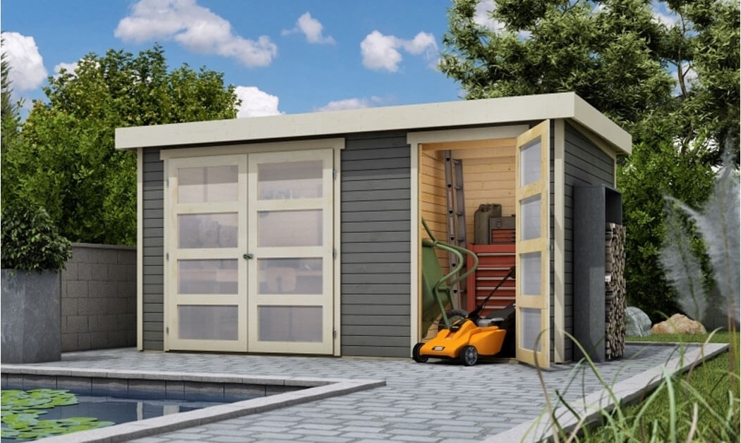 Das Gartenhaus wird aus 19 mm starken Wandbrettern aus nordischer Fichte im Steck-/Schraubsystem gefertigt und gewährleistet somit einen einfachen Aufbau. Das Flachdach besteht aus Dachplatte, sodass das Gartenhaus rasch gegen von oben kommende Witterungseinflüsse geschützt ist. Die Grundfläche beträgt 8,52 qm bei einem umbauten Raum von 17 cbm. Mit einer Seitenhöhe von 195 cm und einer Firsthöhe von 211 cm bietet das Gerätehaus optimale Raumnutzung. Das Gartenhaus ohne Anbauten hat ein Sockelmaß von 400x213 cm. Bodenbalken sorgen für den Schutz von unten und werden unter das Gartenhaus gelegt. Durch die Kesseldruckimprägnierung der Bodenbalken sind diese vor Witterungseinflüssen und holzzersetzenden Pilzen bereits geschützt. Die praktische und vormontierte Tür sorgt mit ihren großzügigen Abmessungen und dem Massivholzrahmen für einen einfachen Zutritt in das Gartenhaus und sichert den Inhalt nebenbei effektiv vor unbefugtem Zugriff. Die Verglasung der Lichtausschnitte sorgt für großzügigen Tageslichteinfall. ### Gartenhaus-Maße: - Außenmaß ca. B 404 x T 217 cm - Sockelmaß ca. B 400 x T 213 cm - Innenmaß gesamt ca. B 396 x T 209 cm - Seitenhöhe ca. 195 cm - Firsthöhe ca. 211 cm - Grundfläche ca. 8,52 m² - umbauter Raum ca. 17 m³ - Dachfläche ca. B 428 x T 238 cm (10 m²) - Dachüberstand vorn ca. 18 cm / hinten ca. 7 cm - Dachüberstand links ca. 14 cm / rechts ca. 14 cm - Dachneigung 3° - Schneelast bis 75 kg/m² ### Gartenhaus-Ausstattung: - Wände nordische Fichte in 19 mm Wandstärke, außen terragrau / innen naturbelassen - Flachdach, 16 mm Dachplatte - Doppelflügeltür mit Lichtausschnitt(en) aus Kunstglas (Durchgangsmaß ca. 166,5x176,5 cm), Sicherheitsüberfalle - Zweite Tür (Durchgangsmaß ca. 81,5x175 cm), mit Überfalle - kesseldruckimprägnierte Bodenbalken für Schutz von unten Versieh dein Gartenhaus mit einer schützenden Dacheindeckung! Bedarf für Dacheindeckung: 3 Rolle(n) Dachbahn Lieferung als Bausatz inkl. Montage-Zubehör und ausführlicher Aufbauanleitung, ohne Dacheindeckung und Fußboden.