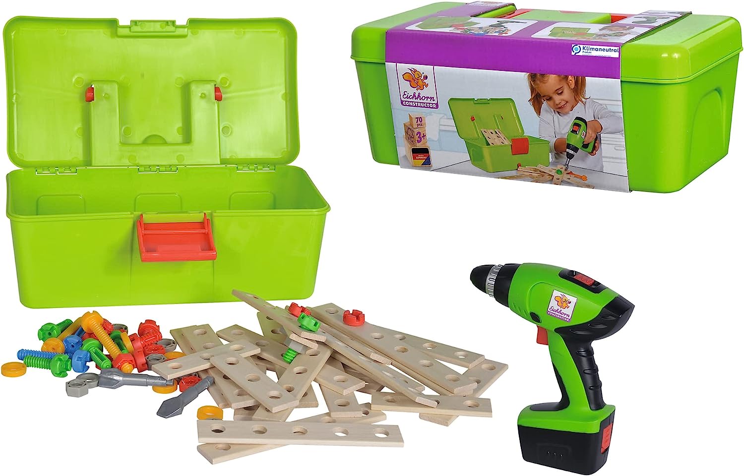 Der Eichhorn Constructor Baukasten mit 70 Teilen bietet Kindern ab 3 Jahren kreativen Spielspaß und fördert ihre motorischen Fähigkeiten. Besonders hervorzuheben ist die batterielose Bohrmaschine/Akkuschrauber, die das Spielerlebnis realistischer gestaltet. Die gute Qualität des Sets, vor allem der hohe Holzanteil, sorgt für langlebige Freude beim Bauen und Konstruieren.