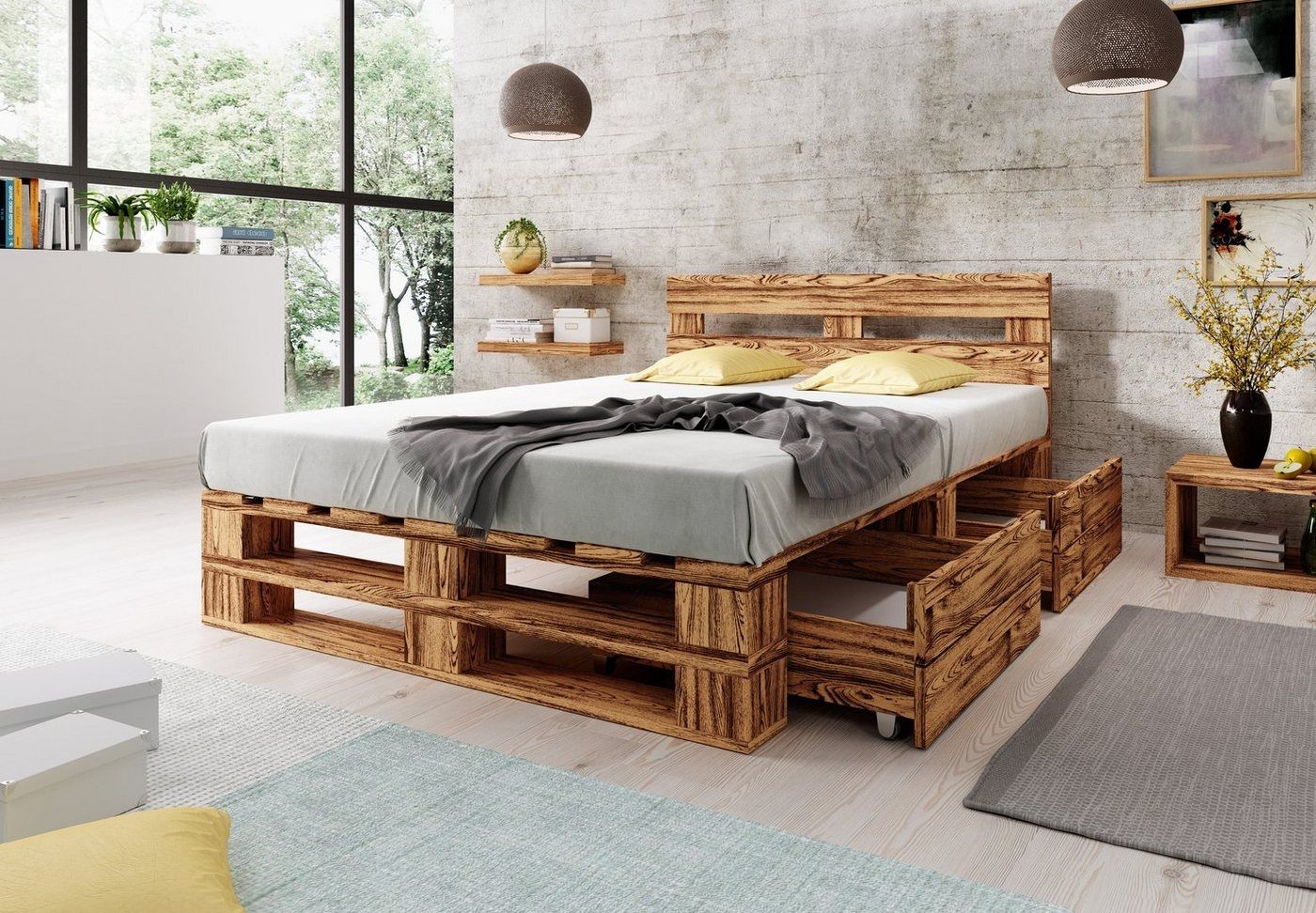 | Name | sunnypillow Palettenbett M2 aus Holz mit Lattenrost und 2 Bettkästen, 2 x Bettschubladen Geflammt |
