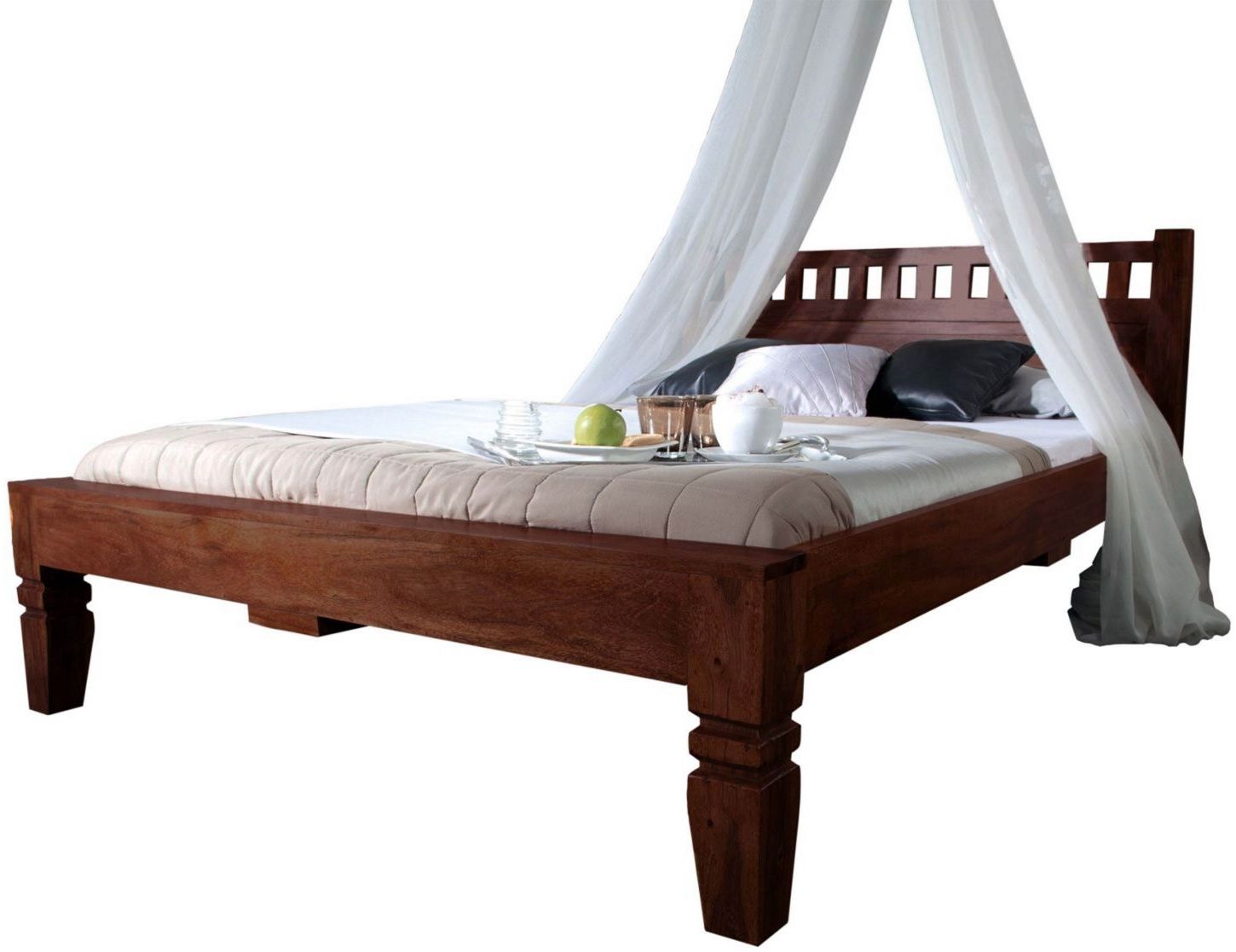 Das Bett OXFORD aus vollmassivem Akazienholz in nougat (dunkelbraun) lackiert, vereint klassischen Landhaus-Stil mit Funktionalität. Die Oberfläche ist alltagstauglich und lässt die natürliche Holzmaserung sichtbar. Mit Außenmaßen von ca. 187 x 217 x 90 cm und einer Liegefläche von 180x200 cm bietet es Stabilität und Komfort. Der Rahmen hat eine Einlegetiefe für den Lattenrost von ca. 11 cm und ist bis ca. 220 kg belastbar. **Highlights** - Vollmassives Akazienholz für Langlebigkeit - Nougat lackiert für eine schützende und ansprechende Oberfläche - Klassischer Landhaus-Look mit feinen Holzarbeiten - Hohe Belastbarkeit bis ca. 220 kg - Pflegeleicht und individuell durch natürliche Merkmale **Produkteigenschaften** - Außenmaße: ca. 187 x 217 x 90 cm (B/T/H) - Liegefläche: 180x200 cm - Einlegetiefe für Lattenrost: ca. 11 cm - Gewicht: ca. 66 kg - Zerlegt geliefert, Montage vorbereitet **Lieferumfang** - Bettgestell - Beschläge und Montageanleitung - Lieferung ohne Dekoration, Beleuchtung, Matratze und Lattenrost