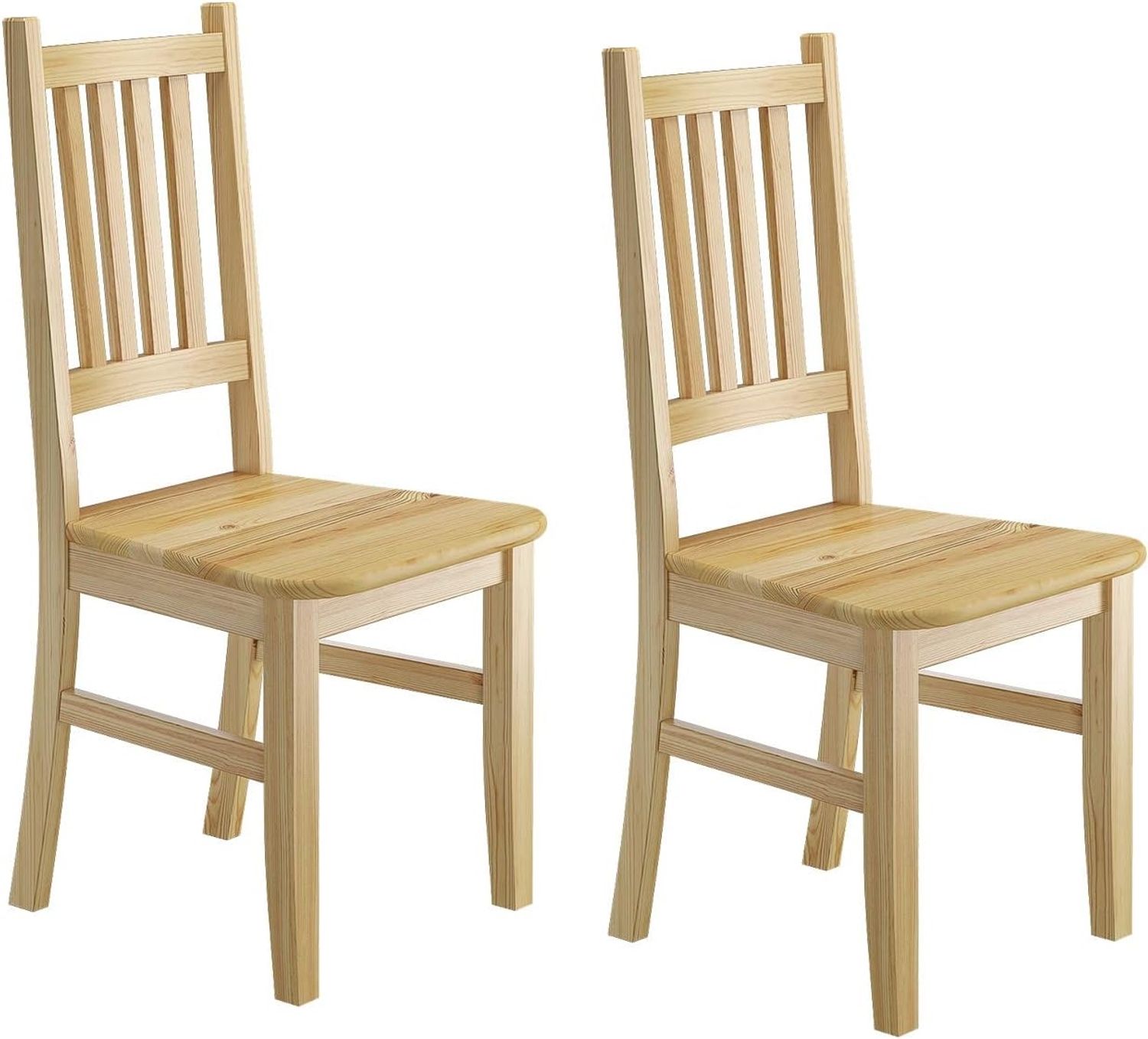 **2 schöne stabile Massivholz-Stühle Set für Küche und Esszimmer** schlichte gerade Form für vielfältigen Einsatz **Naturprodukt Holz.... logisch!** **Beschreibung:** solide Verarbeitung stabile Ausführung aus massiver Kiefer fein geschliffene Oberflächen, natur lackiert, dadurch pflegeleicht und abwischbar stabil und standfest Die Lieferung der Stühle erfolgt zerlegt inklusive Montageanleitung **Maße: 100 x 42 x 42 cm Sitzhöhe ca. 45 cm Sitzfläche ca. 39x42 cm Lieferumfang: 2 Stühle ohne Zubehör oder Dekoration die Bilder dienen nur als Stilbeispiel - Lieferung erfolgt mit mittlerer Strebe**