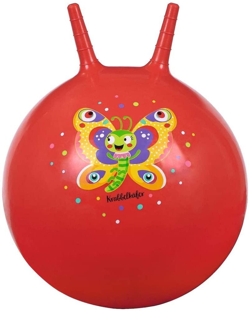Hüpfbälle erfreuen Kinder rund um den Globus. Mit dem roten Krabbelkäfer Hüpfball sind schon ganz junge Hüpfer ab 4 Jahren bereit für große Sprünge. Besonders niedlich ist der große aufgedruckte Schmetterling, der in kunterbunten Farben strahlt. Der aus robustem Kunststoff gefertigte Ball ist schnell mit einer Fuß-, Hand- oder Elektropumpe aufgepumpt und dann kann der Hüpfspaß auch schon losgehen. Kleine Rillen an den Griffen sorgen für einen optimalen Halt beim Springen, damit auch kleine Kinder nicht abrutschen. Der Hüpfball kann sowohl drinnen als auch draußen verwendet werden und bietet so das ganze Jahr über unbegrenzten Hüpfspaß. Das Springen mit dem Ball macht nicht nur wahnsinnig viel Spaß, fördert spielerisch auch den Gleichgewichtssinn, die Bewegungskoordination und den Muskelaufbau der Kinder. Bei Bedarf kann der Hüpfball auch wieder entlüftet und in der Verpackung platzsparend verstaut werden. Geliefert wird der Ball in entleertem Zustand, eine Pumpe ist nicht im Lieferumfang enthalten. 80 kg Höhstgewicht. 45 cm durchmesser. + für jede Jahreszeit geeignet+ fördert die Bewegungskoordination und macht Spaß+ Pumpe nicht enthalten Achtung! Nicht geeignet für Kinder unter 3 Jahren. Erstickungsgefahr wegen verschluckbarer Kleinteile!