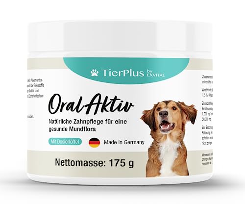 EXVital TierPlus Zahnpflege Pulver für Hunde175g Dose bei Zahnstein, gelben Zähnen, Mundgeruch & Plaque - Natürliche Zahnreinigung & Mundpflege für den Hund
