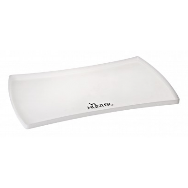 Die Hunter Napfunterlage Selection ist eine rutschfeste, leicht zu reinigende Unterlage aus flexiblem Silikon, die durch ihren hohen Rand das Auslaufen von Wasser und Futter verhindert. Sie bietet ausreichend Platz für zwei Näpfe und hat eine neutrale Optik, die gut in verschiedene Küchen passt. Die Unterlage ist spülmaschinenfest, jedoch sollte darauf geachtet werden, sie unterhalb trocken zu halten, um Feuchtigkeit zu vermeiden.
