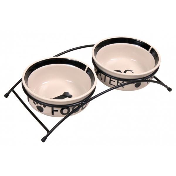 "Erhöhte Keramiknäpfe im stabilen Metallständer fördern eine gesunde Fressposition und verhindern Verrutschen."