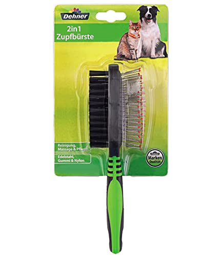• Die Dehner Hunde- und Katzenfellpflege ist eine praktische 2 in 1 Zupfbürste, die mit Edelstahlborsten und Gummiborsten zum Entwirren des Fells sowie weichen Nylonborsten zum Reinigen, Pflegen und Glätten ausgestattet ist