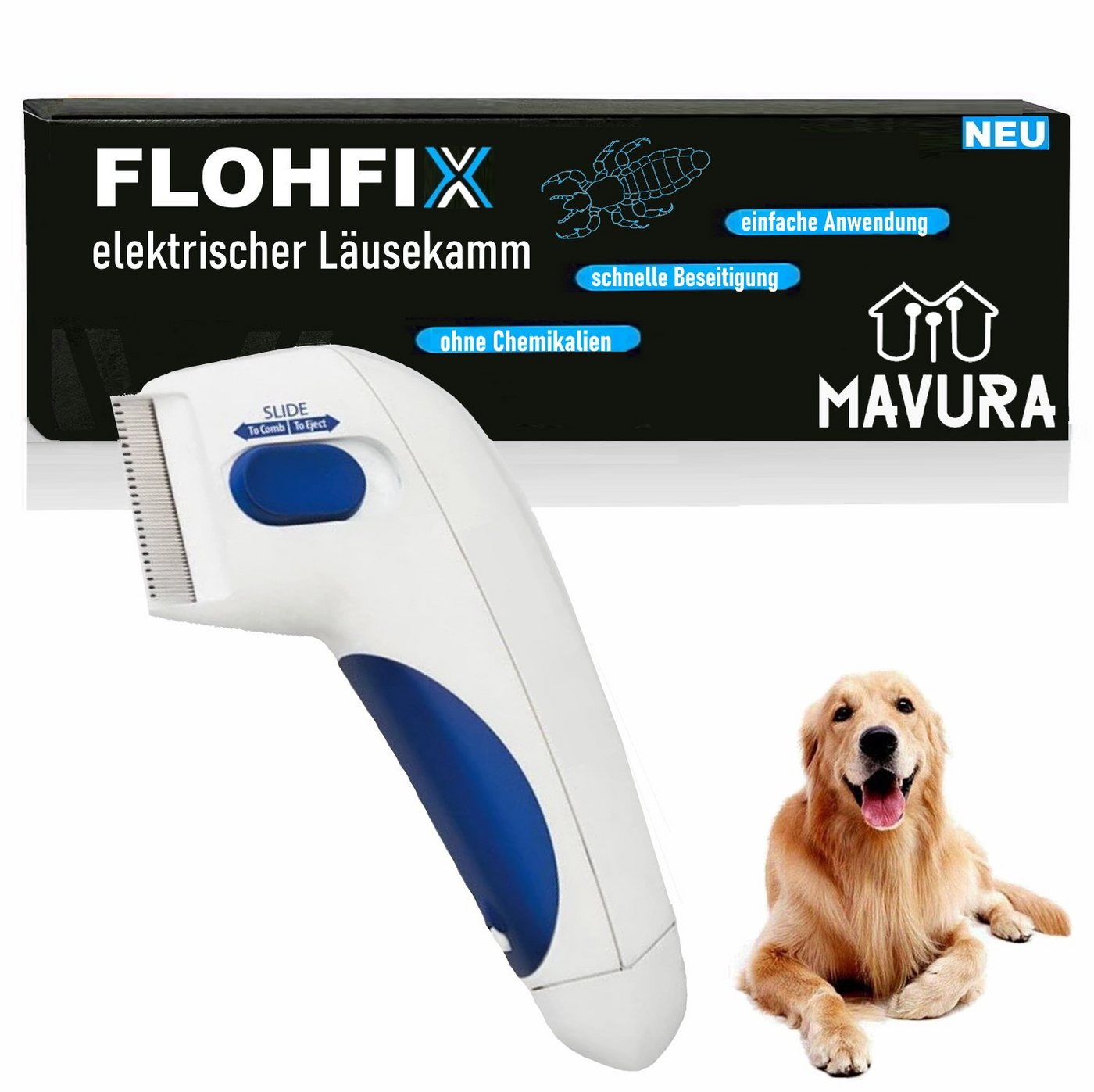 MAVURA Flohkamm FLOHFIX elektrischer Läusekamm Nissenkamm Flohkamm HundeKatzen Kinder Läusekamm, Weiß