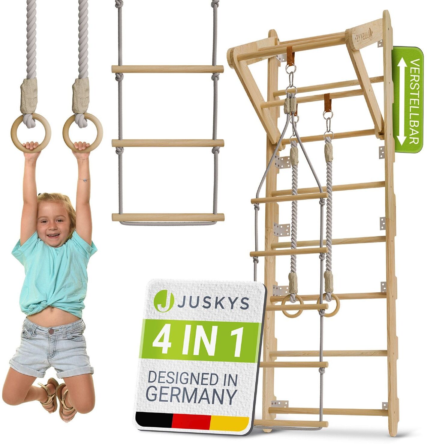 | Beschreibung | Entdecken Sie die Juskys Sprossenwand für Kinder – das ideale Klettergerüst für kleine Abenteurer im Kinderzimmer. Mit einer Größe von 62 x 210 x 57 cm und einer maximalen Belastbarkeit von 100 kg (Sprossenwand) bietet dieses robuste Holzgerät unzählige Möglichkeiten für Spiel und Bewegung. Die abnehmbare Strickleiter, Turnringe und die Klimmzugstange fördern spielerisch die motorischen Fähigkeiten und die körperliche Entwicklung Ihrer Kinder. **Highlights** - Fördert motorische Fähigkeiten spielerisch - Platzsparendes Klettergerüst für Zuhause - Robustes Design aus Holz für langanhaltenden Spaß - Mehr Turnspaß dank Strickleiter und Turnringen - Einfacher Aufbau und sichere Befestigung **Produkteigenschaften** - Farbe: Natur - Max. Belastbarkeit: 100 kg (Sprossenwand), 70 kg (Klimmzugdreieck), 50 kg (Seile) - Altersempfehlung: 3 - 12 Jahre - Abmessungen (BxHxT): 62 x 210 x 57 cm - Sprossen: Ø 3 cm - Sprossenabstand: 25 cm - Turnringe: Ø 12 cm - Material: Holz, Polypropylen **Lieferumfang** - 1 x Sprossenwand für Kinder - 1 x Klimmzug-Dreieck - 1 x Strickleiter - 1 x Turnringe - 1 x Anleitung |