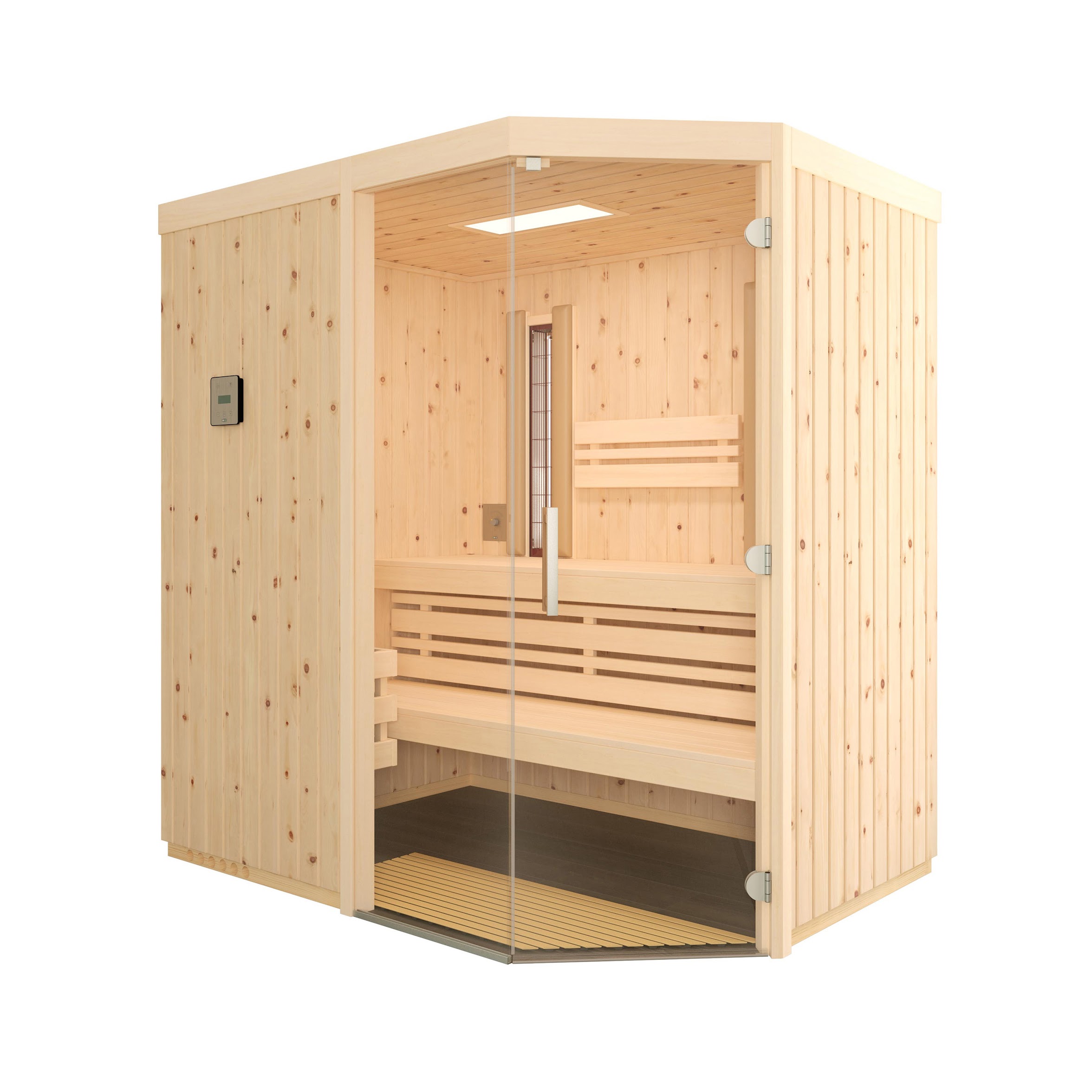 Bietet eine vielseitige Nutzung als finnische und Dampfsauna mit hochwertigem Alpen-Zirbenholz und einem leistungsstarken Verdampferofen.