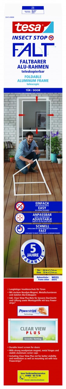 Der tesa Fliegenschutz-Tür FALT bietet Ihnen die Möglichkeit, Ihre Räume vor lästigen Insekten zu schützen, ohne dabei auf frische Luft verzichten zu müssen. Der robuste Aluminiumrahmen und das dichte Fliegengitter sorgen für eine hochwertige Verarbeitung und eine effektive Abwehr von fliegenden Plagegeistern. Dank des genialen Teleskoprahmensystems ist kein Sägen erforderlich, was den Aufbau erleichtert.