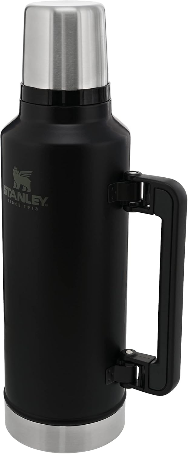 Die Stanley Classic Vakuum-Flasche ist die perfekte Begleitung für unterwegs. Hergestellt aus rostfreiem 18/8 Edelstahl und mit einer schützenden matt schwarzen Lackierung versehen, ist sie nicht nur robust, sondern auch stilvoll. Die doppelwandige Vakuum-Isolation hält Getränke bis zu 45 Stunden heiß oder bis zu 48 Stunden kalt. Der seitlich montierte Kunststoff-Tragegriff ermöglicht einen problemlosen Transport. Über dem Flaschenverschluss befindet sich ein isolierender Trinkbecher. Mit einer Öffnung von 5 cm lässt sich die Flasche leicht reinigen. Mit einem Fassungsvermögen von 1,9 Litern bietet sie ausreichend Platz für Ihre Lieblingsgetränke. Die Stanley Classic Vakuum-Flasche ist spülmaschinengeeignet und erfüllt den FDA-Standard. **Highlights** - Hält Getränke bis zu 45 Stunden heiß oder bis zu 48 Stunden kalt: Dank der doppelwandigen Vakuum-Isolation bleiben Ihre Getränke länger auf der gewünschten Temperatur. - Robust und stilvoll: Die aus rostfreiem 18/8 Edelstahl gefertigte Flasche ist mit einer schützenden matt schwarzen Lackierung versehen. - Einfacher Transport: Der seitlich montierte Kunststoff-Tragegriff ermöglicht einen problemlosen Transport. - Isolierender Trinkbecher: Über dem Flaschenverschluss befindet sich ein isolierender Trinkbecher, der Ihre Getränke länger warm oder kalt hält. - Leicht zu reinigen: Mit einer Öffnung von 5 cm lässt sich die Flasche leicht reinigen. **Produkteigenschaften** - Marke: STANLEY - Farbe: silber / schwarz - Material: Edelstahl - Höhe: 37,5 cm - Durchmesser: 12,8 cm - Gewicht: 1130 g - Volumen: 1,9 l - Spülmaschinengeeignet: ja