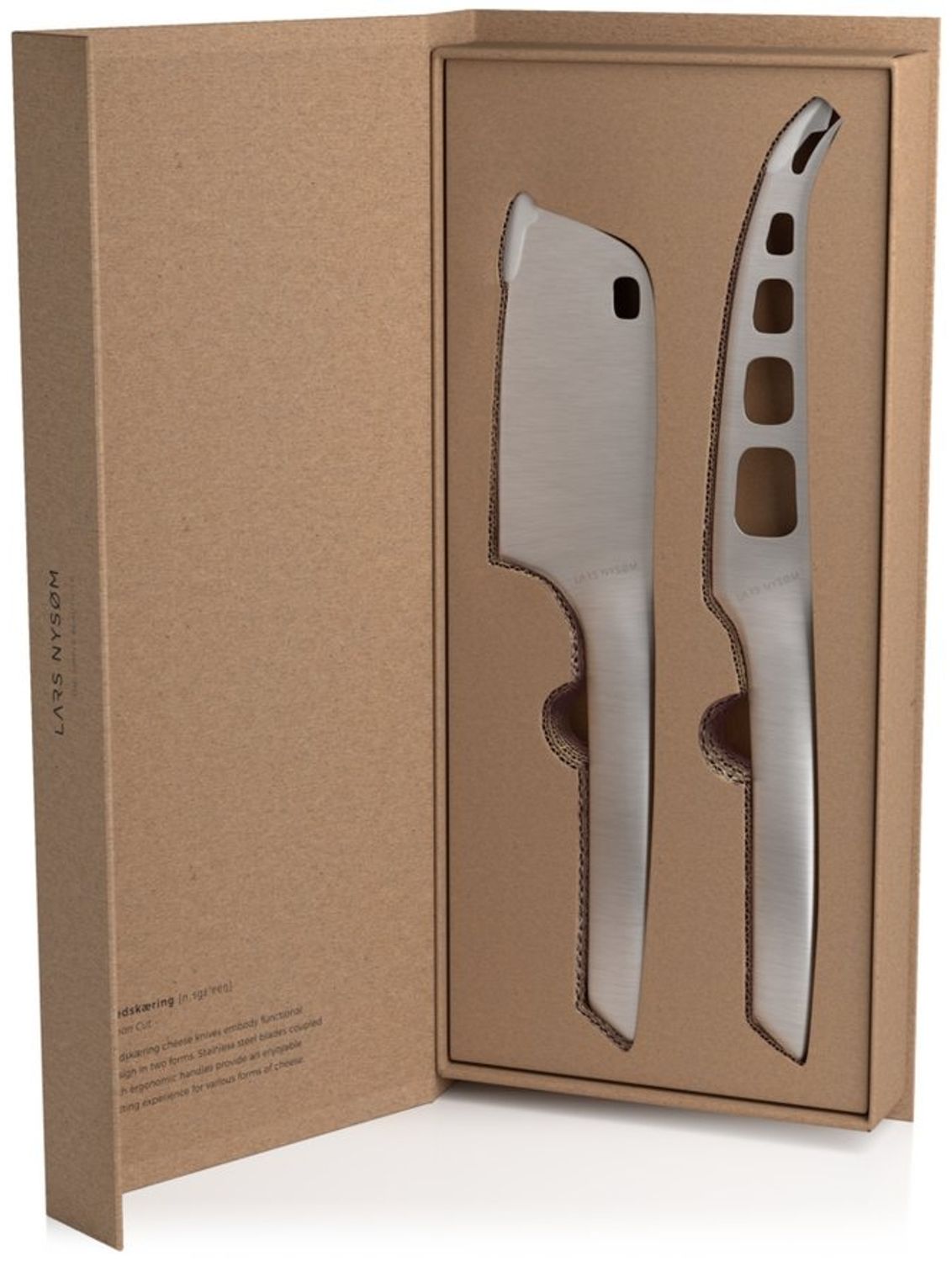 Die Käsemesser „Nedskæring“ von LARS NYSØM vereinen funktionales Design mit hervorragender Schneidetechnik. Das Set besteht aus einem Käseschneider für Weichkäse und einem Käsebeil für Hartkäse, beide mit gehärteten Klingen aus rostfreiem Stahl. Ergonomische Griffe sorgen für eine optimale Handhabung, auch für Linkshänder. Ideal für den Einsatz zu Hause oder in der Gastronomie, ist dieses Set auch ein perfektes Geschenk. **Highlights** - Funktionales Design für den Esstisch - Käseschneider und Käsebeil für verschiedene Käsearten - Gehärtete Edelstahlklingen für präzises Schneiden - Ergonomische Griffe für optimalen Komfort - Schlichte Geschenks-Verpackung für besondere Anlässe **Produkteigenschaften** - Material: Edelstahl - Set-Bestandteile: 1x Käseschneider, 1x Käsebeil - Geeignet für Linkshänder **Lieferumfang** - 1x Käseschneider - 1x Käsebeil - Keine weiteren Produkte im Lieferumfang enthalten
