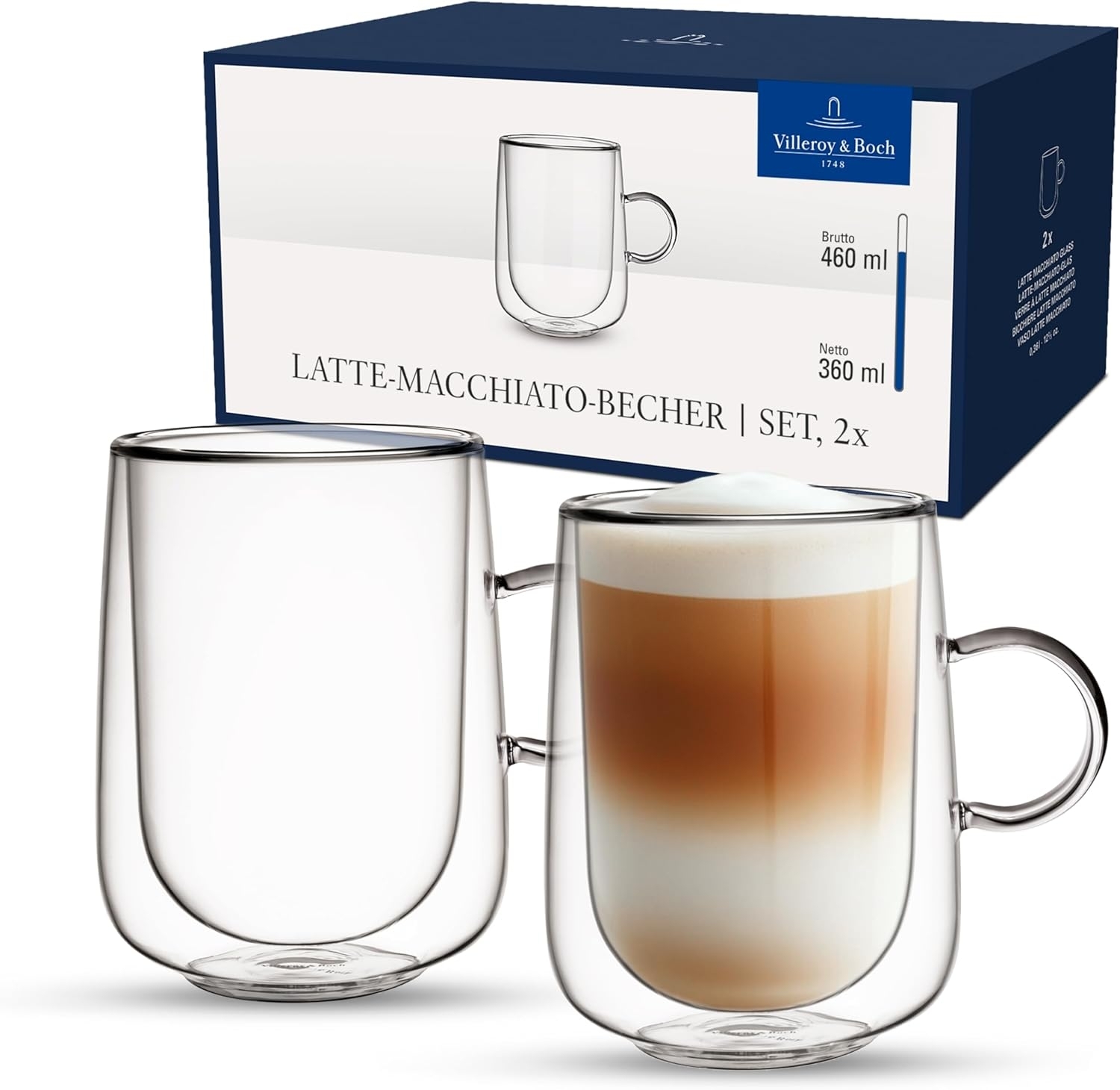 **Villeroy & Boch Artesano Hot & Cold Beverages Latte-Macchiato-Gläser 360 ml 2er Set** Die doppelwandigen Kaffeebecher aus hochwertigem Borosilikatglas vereinen Funktionalität und Stil für den perfekten Genuss von heißen und kalten Getränken wie Kaffee, Latte Macchiato oder Tee. Dank der doppelwandigen Konstruktion bleibt die Temperatur des Inhalts besonders lange erhalten, während die äußere Oberfläche angenehm kühl bleibt. Die klare Glasoptik bringt die Farben der Getränke optimal zur Geltung und verleiht jedem Moment einen Hauch von Eleganz. Das zeitlose, schlichte Design lässt sich vielseitig kombinieren und ergänzt andere Gläser der Hot & Cold Beverages-Kollektion perfekt – ideal für den morgendlichen Espresso oder den Kaffeegenuss nach einem guten Essen. Hergestellt aus robustem Borosilikatglas, überzeugen die Becher durch ihre Spülmaschinenfestigkeit, Mikrowellensicherheit und außergewöhnliche Kratzfestigkeit, was sie nicht nur für den Alltag, sondern auch für den Einsatz in der Gastronomie ideal macht. **Artikeldetails:** Durchmesser: ca. 9,6 cm Höhe: ca. 12,5 cm Inhalt (netto): ca. 360 ml Inhalt (netto): ca. 460 ml Material: Borosilikatglas Merkmal: Spülmaschinenfest, Mikrowellensicher Lieferungsumfang: 2x Latte-Macchiato-Gläser