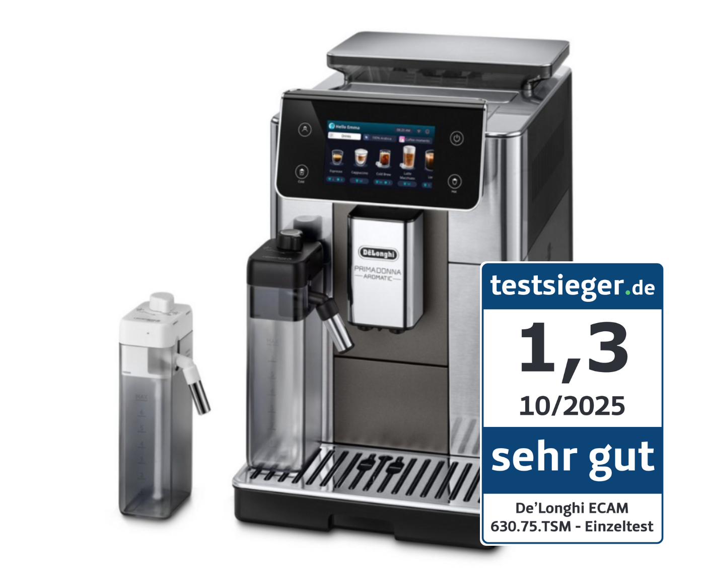 "Die De’Longhi PrimaDonna Aromatic ECAM 630.75.TSM ist ein Vollautomat für Genießerinnen und Genießer, die mehr als nur guten Kaffee wollen. Sie bietet eine außergewöhnliche Vielfalt an Getränken, verbindet Bedienkomfort mit High-End-Technik und liefert konstant hohe Qualität in der Tasse. Im Alltag überzeugt sie mit durchdachter Ausstattung, zuverlässiger Technik und cleveren Details wie Cold Brew auf Knopfdruck oder personalisierten Profilen. Ideal für Haushalte mit mehreren Kaffeetrinkern oder für alle, die Freude an individueller Kaffeekreation haben.