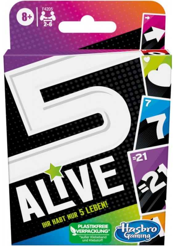 Machen Sie sich bereit für ein unvorhersehbares und rasantes Kartenspiel für die ganze Familie. Das Spiel 5 Alive ist eine spannende Abwandlung des klassischen Spiels 21, bei dem die Spieler nummerierte Karten erhalten und unter 21 bleiben müssen, um am Leben zu bleiben. Tun Sie, was nötig ist, um zu überleben! Gehen Sie Risiken ein, verfolgen Sie eine Strategie und sabotieren Sie Ihre Gegner, um deren Leben aufs Spiel zu setzen. Sobald jemand die 21 überschreitet, dreht er eine seiner Alive-Karten um und wenn er alle 5 Karten umgedreht hat, ist er raus aus dem Spiel. Jokerkarten können einen Gegner ausschalten oder dabei helfen, selbst am Leben zu bleiben, aber sollten strategisch klug eingesetzt werden. Mit alternativen Spielversionen wie „Das plötzliche Spielende“ und „Teamspiel“ kommt Abwechslung hinein. 5 Alive ist ein leicht erlernbares und kurzweiliges Kartenspiel und eignet sich prima für unterwegs, für einen Spieleabend mit der Familie oder eine spontane Party. Warnhinweis: Achtung! Nicht für Kinder unter 36 Monaten geeignet Achtung! Enthält verschluckbare Kleinteile. Erstickungsgefahr. Bei Sortimenten und Großpackungen gilt der angegebene Preis pro Stück. Eine Auswahl ist nur bedingt möglich!