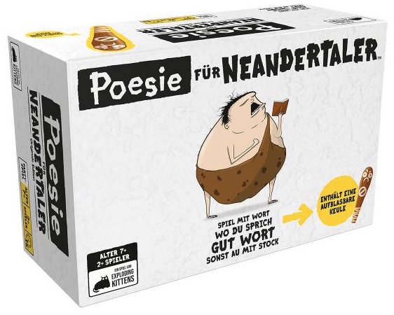 | Beschreibung | Im Partyspiel Poesie für Neandertaler werden die Spieler zu Neandertalern, die muntere Verse rezitieren möchten, doch das gestaltet sich schwierig: Neandertaler kennen keine Wörter, die mehr als eine Silbe haben!In zwei Teams müssen die Spieler auf Zeit Begriffe erklären und dürfen dabei nur Wörter mit einer Silbe benutzen. Wessen Steinzeit-Vokabular nicht einsilbig genug ist, bekommt einen Hieb mit der aufblasbaren Nö!-Keule. |
