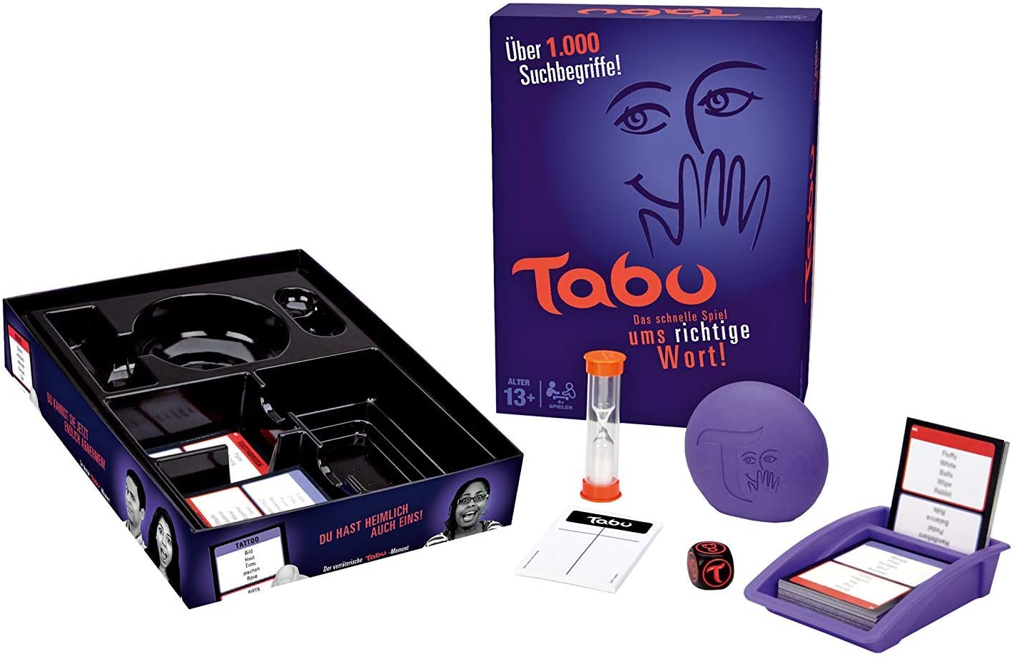 *Fantasie und Sprachwitz sind gefragt, wenn du Begriffe erklären musst, ohne die Tabu-Wörter auf der Spielkarte zu verwenden. Mit Tabu-Würfel für mehr Spielvarianten und dem Quietschie bringt Tabu garantierten Spielspaß in jede Partyrunde.* ### Gute-Laune-Spiel für jede Party Tabu gehört zu den meistverkauften Spielen der Welt und ist ein echter Partyklassiker. Mit viel Fantasie und Sprachwitz versuchen Spieler Begriffe zu erklären – die vorgegebenen Wörter auf den Spielkarten sind jedoch tabu und dürfen nicht zu Hilfe genommen werden. Das Team, das am Ende die meisten Karten für sich gewinnen kann, gewinnt Tabu. Diese Spielausgabe ist ganz besonders, denn in ihr vereinen sich die beliebtesten Tabu-Begriffe aller bisher erschienenen Ausgaben: Ein echter Best-of-Klassiker also. Zusätzlich enthält das Spiel einen Würfel, der für jede Runde neue Sonderregelungen festlegt. ### So wird gespielt In jedem Spiel treten zwei Teams gegeneinander an. Die Sanduhr wird umgedreht und die erste Gruppe beginnt. In der vorgegebenen Zeit versucht nun ein Spieler seinen Teammitgliedern so viele Begriffe wie möglich zu erklären. Die Spielkarte, die der Erklärer dabei verdeckt in der Hand hält gibt vor, welche Wörter er dabei nicht verwenden darf. Das gegnerische Team muss daher wachsam sein und aufpassen, welche Wörter der Erklärer verwendet. ### Der Zauberwürfel Bei dieser Spielausgabe von 2013 gibt es eine Neuerung: Vor jeder Runde wird der Tabu-Würfel geworfen, womit eine bestimmte Regel festgelegt wird. Beispielsweise darf nur ein Teammitglied das gesuchte Wort raten, während die Mitspieler zuhören müssen. Ein anderes Symbol auf dem Würfel legt fest, dass die Zeit verdoppelt wird. So können auch die vermeintlichen Verlierer-Teams schnell an viele Punkte gelangen.