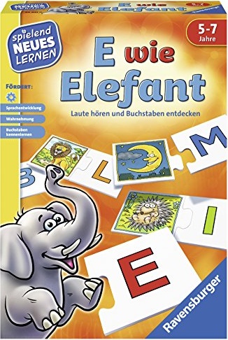 „E wie Elefant“ ist ein hochwertiges Lernspiel von Ravensburger, das Vorschulkinder spielerisch an Buchstaben und Laute heranführt. Es bietet mehrere Spielvarianten, die an den Entwicklungsstand der Kinder angepasst werden können. Das Spiel fördert die Sprachentwicklung und ist sowohl für Vorschulkinder als auch für den Übergang in die 1. Klasse geeignet.