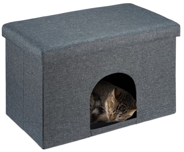 Mit der Katzenhöhle mit Sitzauflage in Grau (10047389) schaffen Sie eine gemütliche Ruheoase für Ihre Katze. Der stilvolle, dunkelgraue Sitzhocker fügt sich harmonisch in Ihr modernes Zuhause ein und bietet Ihrem pelzigen Freund einen idealen Rückzugsort. Die großzügige Öffnung ermöglicht einen einfachen Zugang, während die entnehmbare Einlage zum Ausruhen einlädt. Die Höhle ist für Katzen und kleine Hunde geeignet und lässt sich bei Nichtgebrauch platzsparend zusammenfalten. **Highlights** - Gemütliches Tierhaus für Katzen und Hunde - Bequeme Haustierhöhle mit gepolsterter Sitzauflage - Schlichter Sitzhocker in Grau, der sich in jeden Raum einfügt - Tierversteck mit abnehmbaren Deckel - Herausnehmbare Einlage zum Liegen **Produkteigenschaften** - Gesamtmaße H x B x T: ca. 38,5 x 64,5 x 37,5 cm - Maße Öffnung H x B: ca. 20x22 cm - Traglast: ca. 100 kg - Gewicht: ca. 3,6 kg - Material: MDF, Polyester, Schaumstoff - Farbe: Grau **Lieferumfang** - 1x Katzenhocker - Dekoartikel sind nicht im Lieferumfang enthalten