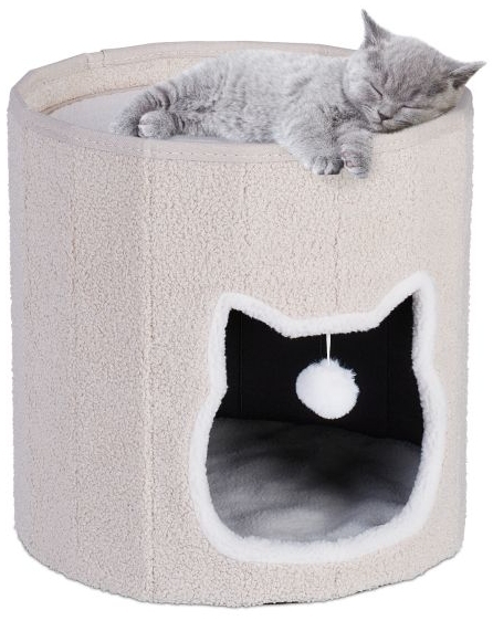 Faltbare Katzenhöhle in Beige 10047873. Diese kuschelige Tierhöhle bietet Ihrer Katze einen gemütlichen Rückzugsort, ideal für entspannte Stunden. Mit einer geräumigen Schlafhöhle, einem weichen Kissen und einem hängenden Katzenspielzeug sorgt sie für hohen Komfort und Spielspaß. Bei Nichtgebrauch lässt sich die Höhle einfach zusammenfalten und platzsparend verstauen. **Highlights** - Gemütlicher Rückzugsort und Schlafplatz in der Wohnung - Entnehmbares, flauschiges Kissen für hohen Komfort - Hängendes, weiches Katzenspielzeug für Spiel und Spaß - Platzsparend zusammenfaltbar bei Nichtgebrauch - Großes Katzenversteck mit Höhle und Aussichtsebene **Produkteigenschaften** - Maße (H x D): ca. 40x39 cm - Maße gefaltet (H x B x T): ca. 11 x 33 x 43 cm - Maße Eingang (H x B): ca. 20x21,5 cm - Gewicht: ca. 2,3 kg - Material: Polyester, MDF - Farbe: Beige **Lieferumfang** - 1x Katzenhäuschen in Einzelteilen - Anleitung - Dekoartikel sind nicht im Lieferumfang enthalten