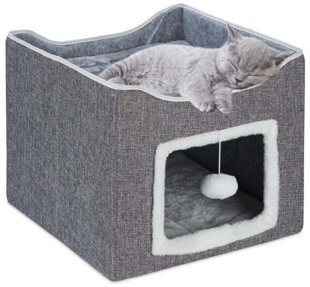 **Kuschelige Katzenhöhle für zwei Katzen – Gemütlicher Rückzugsort** Mit dieser kuscheligen Tierhöhle bietest Du Deiner Katze einen gemütlichen Rückzugsort, falls der alltägliche Trubel in der Wohnung zu stressig wird. Die flauschigen Liegeflächen sorgen für hohen Komfort und laden Deine Samtpfoten zum Entspannen und Schlafen ein. Das Tierhaus verfügt über zwei Schlafplätze und eignet sich daher auch perfekt für zwei Katzen. Bei Nichtgebrauch lässt sich die Kuschelhöhle mit wenigen Handgriffen zusammenfalten und platzsparend verstauen. **Katzenhöhle im Detail:** - **Maße (H x B x T):** ca. 32 x 40 x 40 cm - **Max. Traglast:** ca. 25 kg - **Gewicht:** ca. 1,8 kg - **Material:** Baumwolle, Polyester, MDF - **Farbe:** Grau **Katzenhaus für zwei Katzen:** - **Katzenhöhle (H x B x T):** ca. 18 x 38,5 x 39 cm - **Höhleneingang (H x B):** ca. 15x21 cm - **Oberes Katzenbett (H x B x T):** ca. 10 x 38,5 x 38 cm - **Seitliche Kratzfläche (H x B):** ca. 22x14 cm **Tierversteck für kleine und große Katzen:** - Schnell aufgebautes Katzenversteck mit Kratzfläche - Gemütlicher Rückzugsort und Schlafplatz in der Wohnung - Mit zwei weichen, flauschigen Kissen für extra Komfort - Praktische Kratzfläche zum Krallenwetzen - Inklusive Spielball für Spielspaß und Entdeckung - Bei Nichtgebrauch platzsparend zusammenfalten und verstauen **Lieferumfang:** - 1x Katzenhäuschen - Dekoartikel sind nicht im Lieferumfang enthalten