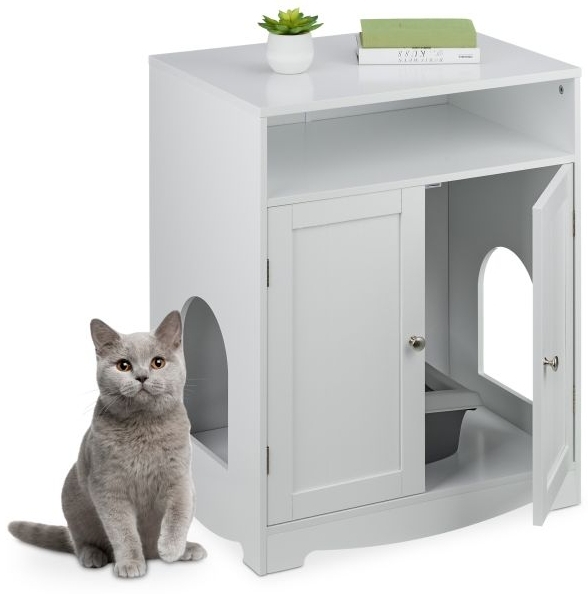 Haustierschrank für die KatzentoiletteSchaffe Deinem Haustier mit diesem großen Katzenschrank einen tollen Rückzugsort. Im Inneren lässt sich das Katzenklo elegant verstecken oder eine gemütliche Kuscheldecke platzieren, damit Dein Stubentiger in Ruhe schlafen kann. Über die offenen Eingänge gelangt Deine Samtpfote selbstständig hinein und heraus. Die Tür erlaubt Dir ein einfaches Entnehmen des Katzenklos zur Reinigung. Katzenzubehör, wie Leckerlis und Spielzeug, kannst Du griffbereit in dem offenen Fach aufbewahren. Katzenkommode für Deinen Vierbeiner --------------------------------------------------------------------------------------------------------------------------------------------------------------------------------------------------------------------------------- - Ideal zum diskreten Verstecken der Katzentoilette - Auch als Rückzugsort für Stubentiger und kleine Hunde - Mit Kissen und Decke als gemütlichen Schlafplatz herrichten - Mit Tür für einfaches Entnehmen des Katzenklos zur Reinigung - 2 offene Eingänge erlauben der Katze selbständiges Ein- und Ausgehen - Offenes Schrankfach zur Aufbewahrung von Katzenzubehör Katzenschrank im Detail --------------------------------------------------------------------------------------------------------------------------------------------------------------------------------------------------------------------- - Gesamtmaße H x B x T: ca. 73,5 x 60 x 43,5 cm - Innenmaße H x B x T: ca. 50 x 57,5 x 42 cm - Eingang H x B: ca. 25x20 cm - Traglast: ca. 35 kg - Gewicht: ca. 14,4 kg - Material: MDF, Zink - Farbe: Weiß Lieferumfang ---------------------------------------------------------------------------------------------------------------------------------------------------------------------------------------------------------- - 1x Katzenschrank in Einzelteilen - Mit Montagematerial - ohne Deko - bebilderte Anleitung Materialzusammensetzung --------------------------------------------------------------------------------------------------------------------------------------------------------------------------------------------------------------------- - 90% Faserplatte - 10% Metall