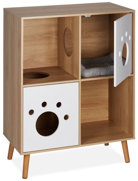 Schaffe Deinem Haustier mit diesem süßem Katzenschrank einen tollen Rückzugsort. Im Inneren lässt sich das Katzenklo elegant verstecken oder eine gemütliche Kuscheldecke platzieren, damit Dein Vierbeiner in Ruhe schlafen kann. Die dekorativen Pfötchen-Eingänge oder die Löcher im Inneren kann dein Samtpfote zum selbstständigen Durchschlüpfen nutzen. Das moderne Katzenhaus mit 4 geräumigen Fächern macht sowohl im Wohn- oder Schlafzimmer eine tolle Figur und setzt moderne Akzente. **Produktdetails:** - Gesamtmaße H x B x T: ca. 96 x 75 x 40 cm - Innenmaße Fächer H x B x T: ca. 38,5 x 35,5 x 38,5 cm - Gewicht: ca. 18,1 kg - Material: PB, MDF, Kiefernholz - Farbe: Natur, Weiß **weitere Details:** - Pfoten-Eingänge D: ca. 15 cm - Durchgänge innen D: ca. 18 cm - Türen H x B: ca. 38x35 cm - Bodenfreiheit: ca. 15 cm - Traglast obere Ablage: ca. 20 kg - Traglast obere Fächer: ca. 10 kg - Traglast untere Fächer: ca. 10 kg Große Katzenkommode mit 4 Fächern. Ideal zum eleganten Verstecken der Katzentoilette. Auch als Rückzugsort für Stubentiger und kleine Hunde. Mit Kissen und Decke noch gemütlicher machen. 2 Eingänge im Pfoten-Design und 3 Durchgänge im Inneren. Passt bestens in Wohn- oder Schlafzimmer sowie Flur. Obere Ablage für Deko, Bilderrahmen, Blumen etc. nutzen **Lieferumfang:** - 1x Katzenklo-Haus in Einzelteilen- - Mit Anleitung & montagematerial- - Inkl. Wandbefestigungsmaterial (optional)- - Dekoartikel sind nicht im Lieferumfang enthalten (EAN: 4052025473877)