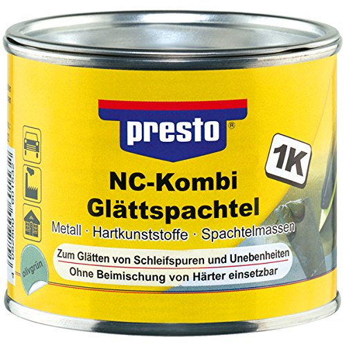 Der Presto NC Glättspachtel ist eine 1K Spachtelmasse, die sich gut für das Glätten von Unebenheiten in 3D-Druckmodellen eignet. Sie lässt sich einfach verarbeiten und erzeugt eine glatte Oberfläche nach dem Schleifen. Die Trocknungszeit kann jedoch variieren, und die Masse zieht sich beim Trocknen zusammen, was mehrere Anwendungen erforderlich macht. Zudem sollte auf den starken Geruch geachtet werden.