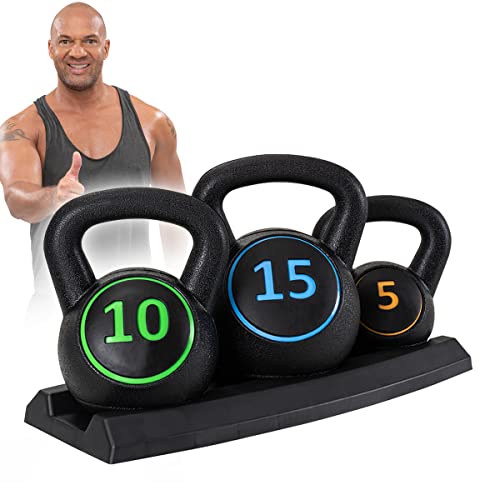 Das Miweba Sports Kettlebell Hanteln Set bietet eine hochwertige Auswahl an Gewichten (5, 10, 15 lbs) und ermöglicht dadurch ein vielseitiges Training für Anfänger, Fortgeschrittene und Profis. Die stabilen Kugelhanteln mit breiten Griffen sorgen für einen bequemen Halt während verschiedener Übungen. Zudem punktet das Set mit einer praktischen Ablage für die Hanteln, die Ordnung schafft und den Trainingsbereich übersichtlich hält.