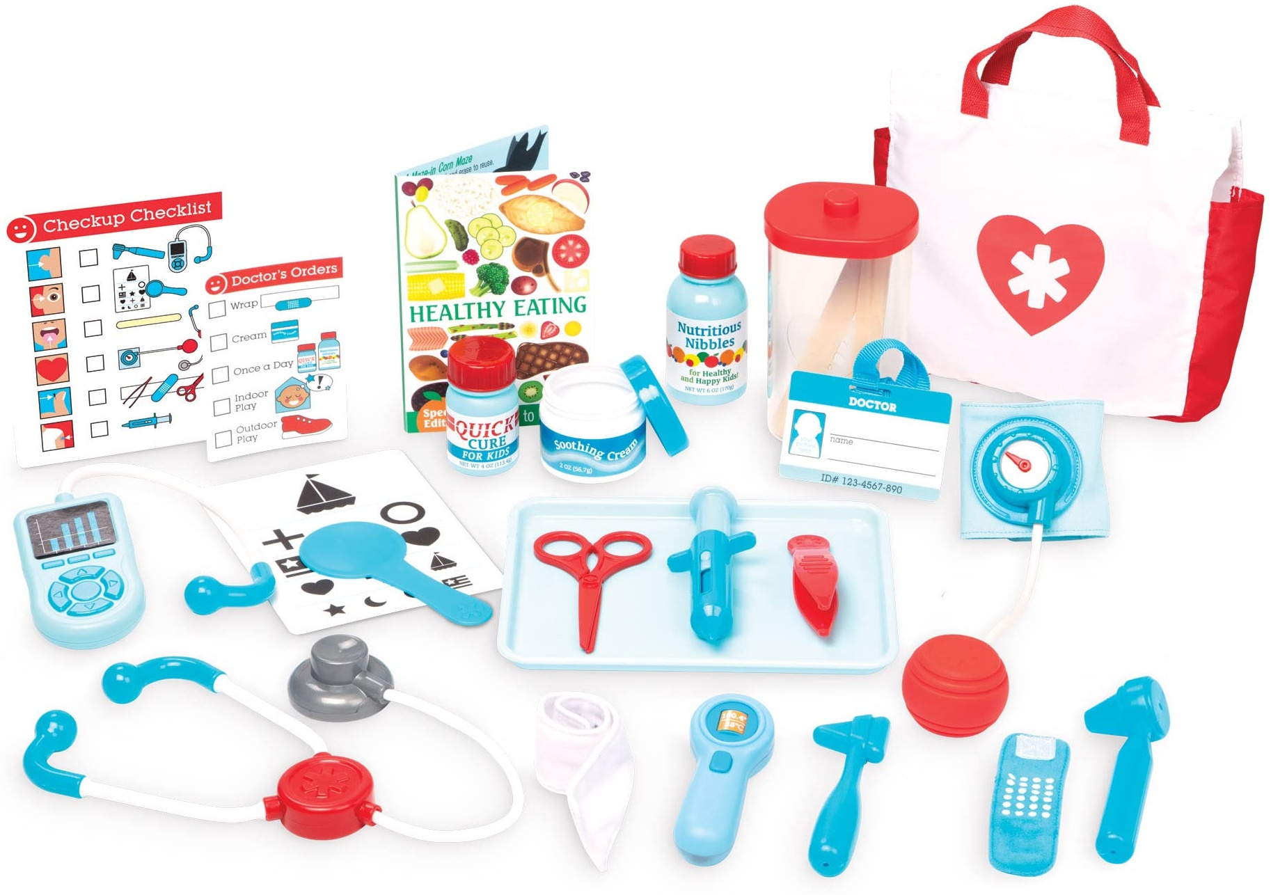 25-teiliges Arztset für Kinder mit realistischen Spielbehandlungsinstrumenten, um Patienten zu untersuchen und zu behandeln Es umfasst ein Spiel-Stethoskop, Blutdruckmanschette, Hörtester, Spritze, Schere, Pinzette, rollendes Stirnthermometer, Reflexhammer, Otoskop, Augenschutz, Behälter mit Zungenspateln, Ausweiskarte, Aktivitätenkarten und mehr Die Teile lassen sich in einem praktischen Beutel aufbewahren, damit sie leicht gereinigt werden können und damit die angehenden jungen Ärzte Hausbesuche machen können Eine unterhaltsame und tolle Möglichkeit, Stressgefühle im Zusammenhang mit einem Arztbesuch abzubauen und ein phantasievolles, aufbauendes und einfühlsames Spiel zu fördern Tolles Geschenk für Vorschulkinder im Alter von 3 bis 6 Jahren zum interaktiven, bildschirmfreien Spielen, Hersteller: Melissa & Doug