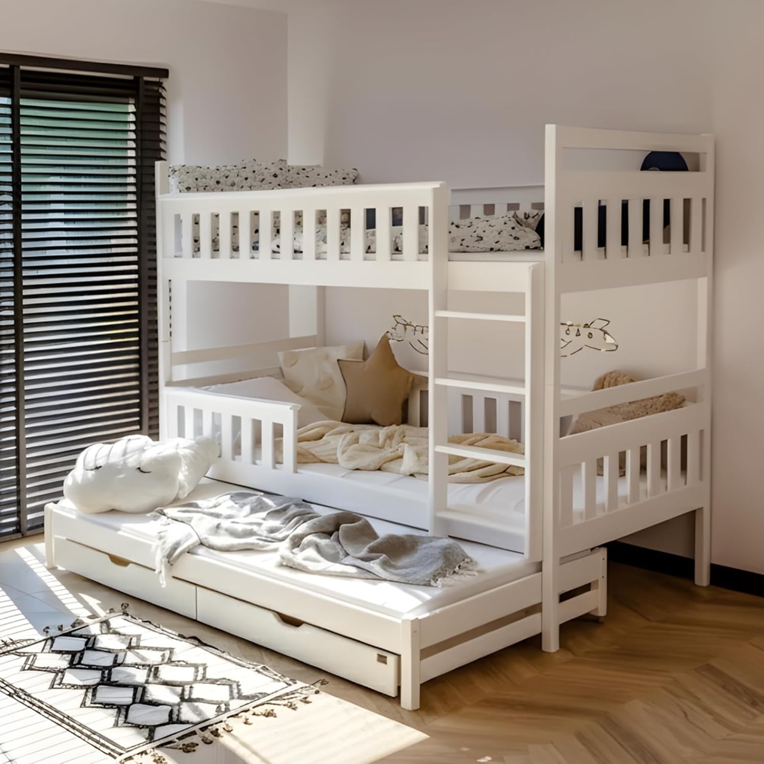 Entdecken Sie unser EUROPÄISCHES QUALITÄTSPRODUKT - das ideale Bett für Ihre Familie! Unser Bett wird in einem modernen Meisterbetrieb in der EU hergestellt, der höchsten Qualitätsstandards gerecht wird. Wir legen großen Wert auf faire und nachhaltige Produktionsbedingungen, daher besuchen wir unseren Partnerbetrieb regelmäßig, um sicherzustellen, dass diese Standards eingehalten werden. Ihr Vertrauen in unsere Produkte ist uns wichtig. Sicherheit steht bei uns an erster Stelle. Unser Bett ist aus FSC Kiefer-Vollholz gefertigt und nach den höchsten Normen zertifiziert. Die verwendeten Farben sind wasserbasiert, kinderfreundlich und geruchslos. Sie sind leck- und speichelfest, sodass Sie sich keine Sorgen um die Gesundheit Ihres Kindes machen müssen. Unser Bett ist so konstruiert, dass es bis zu 100 kg auf jeder Liegefläche tragen kann, was Ihnen zusätzliche Sicherheit gibt. Praktisch und platzsparend ist unser Bett mit einem 90x190 Rausziehbett ausgestattet, das über einen vollwertigen Lattenrost verfügt. So können Sie sicherstellen, dass jedes Übernachtungsgast bequem schläft. Wenn das Rausziehbett nicht in Gebrauch ist, können Sie es einfach unter dem Hauptbett verstauen, um Platz zu sparen. Wir wissen, wie wichtig Stauraum in Kinderzimmern ist. Deshalb verfügt unser Bett über zwei Schubladen, in denen Sie das Chaos des Tages im Handumdrehen verstauen können. Ihre Kinder können in Ruhe ins Bett gehen, ohne sich um Unordnung sorgen zu müssen. Selbst in kleinen Zimmern bietet unser Bett schlauen Stauraum. Unser Bett ist nicht nur praktisch, sondern auch flexibel. Es kann optional in zwei einzelne Betten (90x200) und ein 90x190 Bett umgebaut werden, um den Bedürfnissen Ihrer Familie gerecht zu werden. Die Fußenden sind mit bodenschonenden Gummikreiseln versehen, sodass Ihr Fußboden auch nach dem Umbau in einwandfreiem Zustand bleibt. Investieren Sie in ein Bett, das nicht nur höchsten Qualitätsstandards entspricht, sondern auch sicher, praktisch und flexibel ist. Unser EUROPÄISCHES QUALITÄTSPRODUKT wird die Bedürfnisse Ihrer Familie erfüllen und Ihrem Zuhause Komfort und Stil verleihen. Kaufen Sie noch heute und schaffen Sie eine gemütliche Schlafumgebung für Ihre Lieben.