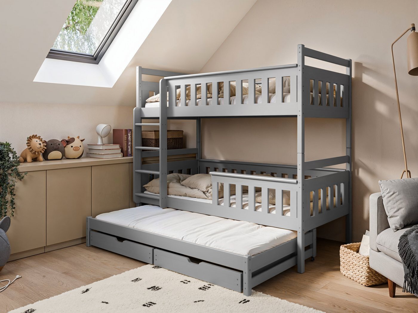 | Name | Deine Möbel 24 Etagenbett Hochbett Kinderbett Stockbett KEV für 3 Kinder 90x200 Aschgrau (Set, 3-St, Funktionsbett mit Rausfallschutz, Lattenrost und Bettkasten), aus Kiefernholz Massivholz in 2 Einzelbetten umbaubar mit Ausziehbett |