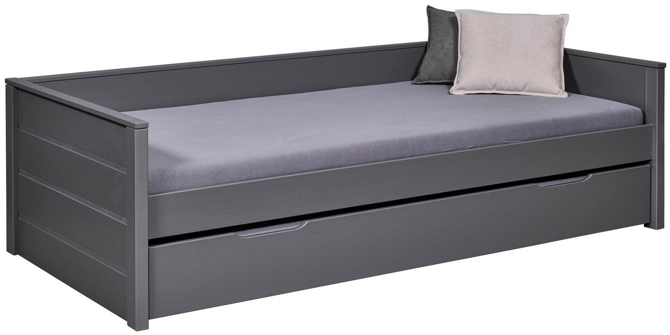 Beschreibung Inter Link Funktionsbett Dream the Future bietet zwei Liegeflächen von 90 x 200 cm und überzeugt durch sein modernes Design sowie seine Funktionalität. Das Bett aus massivem Kiefernholz in Grau verfügt über eine ausziehbare Schublade, die als zusätzlicher Schlafplatz oder Stauraum genutzt werden kann. Der mitgelieferte Lattenrost sorgt für optimalen Schlafkomfort. **Highlights** - Ausziehbare Schublade für zusätzlichen Schlafplatz oder Stauraum - Gefertigt aus massivem Kiefernholz für Langlebigkeit - Pflegeleichte, wasserabweisende Oberfläche - Sichtbare Echtholzmaserung für individuellen Charakter - Entspricht europäischen Qualitätsstandards **Produkteigenschaften** - Maße (BxTxH): ca. 208 x 60 x 98 cm - Farbe: Grau - Material: Massivholz (Kiefer) - Lattenrost im Lieferumfang enthalten **Lieferumfang** - Funktionsbett Dream the Future - Lattenrost - Matratze nicht im Lieferumfang enthalten
