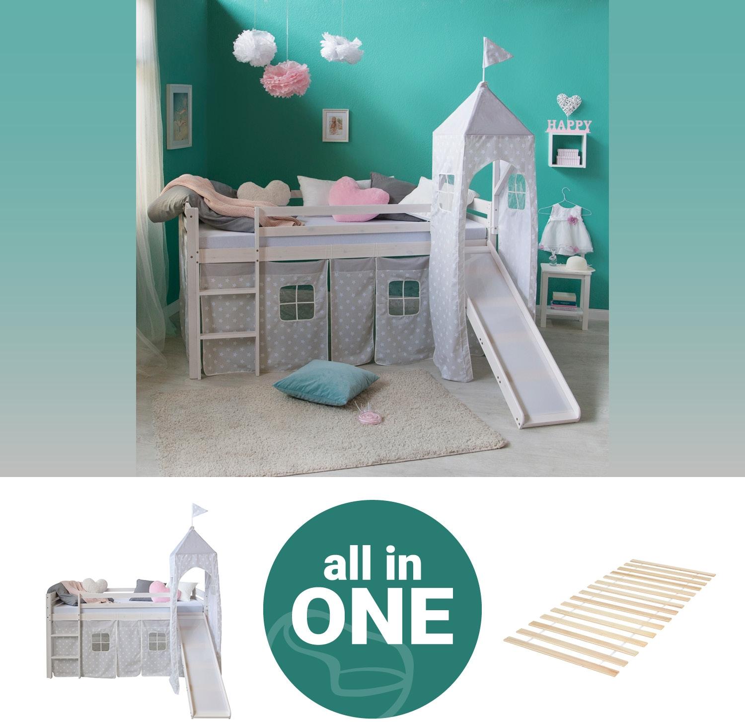 | Lieferumfang | 1x Hochbett, 1x Lattenrost, 1x Rutsche, 1x Turm, 1x Vorhang (Sternenmuster) |