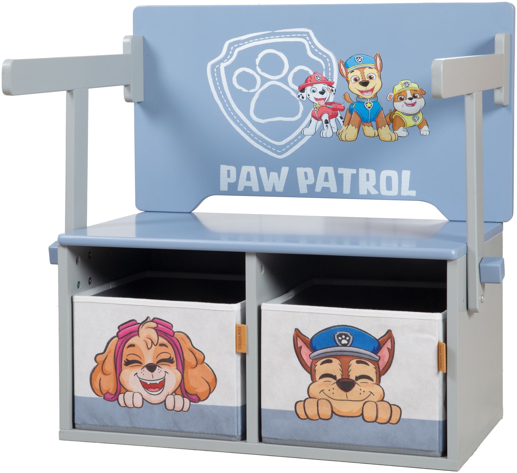 Die klappbare Sitzbank 'Paw Patrol' von roba ist die ideale Sitzgelegenheit für kleine Fans der beliebten Zeichentrickserie. Sie bietet nicht nur einen bequemen Platz, sondern auch praktische Aufbewahrungslösungen durch zwei wendbare Aufbewahrungsboxen aus robustem Canvas. Die Sitzbank kann einfach in einen Kindertisch umgebaut werden und überzeugt durch ihre stabile Konstruktion sowie die hautneutrale Lackierung. **Highlights** - Klappbare Sitzbank mit Paw Patrol Motiven - Umbaubar zum Kindertisch - Wendbare Aufbewahrungsboxen aus robustem Canvas - Hergestellt aus robustem Holz - Entspricht aktuellen Sicherheitsstandards für Kindermöbel **Produkteigenschaften** - Abmessungen Sitzbank: H 65,5 x L 60 x T 35 cm - Tischplatte (im umgebauten Zustand): L 63 x B 34 cm - Abmessungen der wendbaren Boxen: H 20 x B 27 x T 27 cm - Farbe: grau / blau - Geeignet für Kinder ab 18 Monaten **Lieferumfang** - Klappbare Sitzbank Paw Patrol - 2 wendbare Aufbewahrungsboxen - Ohne zusätzliches Zubehör