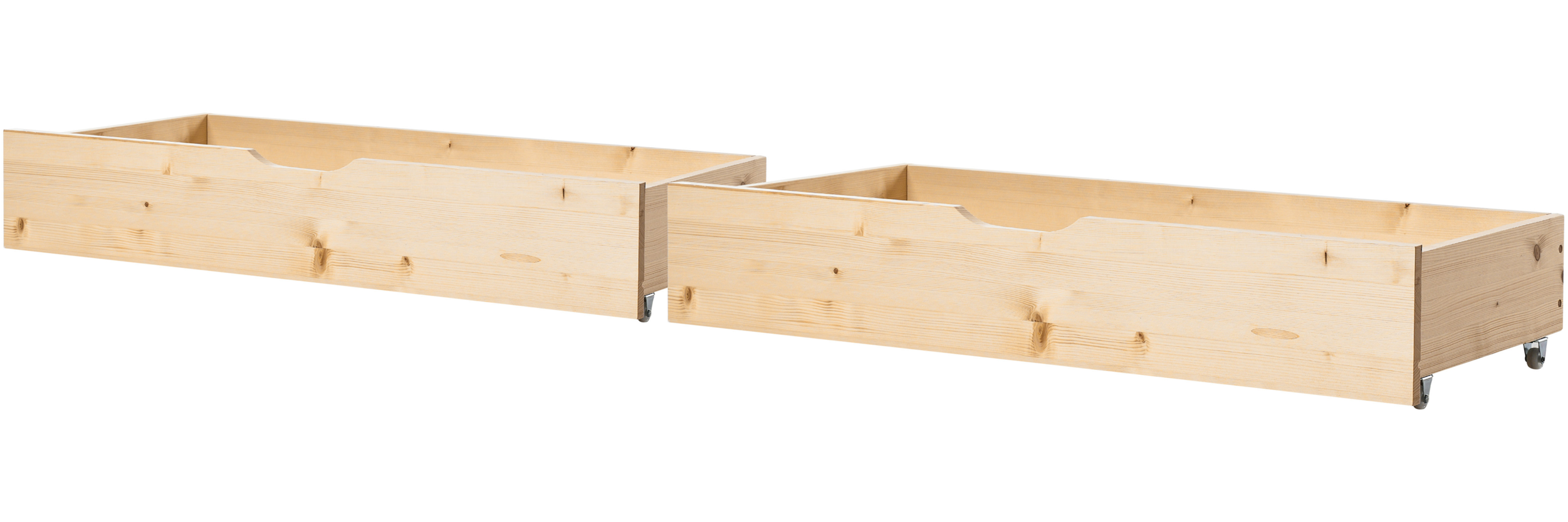 Zwei geräumige Bettschubladen aus lackiertem Kiefernholz bieten zusätzlichen Stauraum für Ihr Kinderbett. Mit praktischen Griffmulden und leichtgängigen Rollen lassen sich die Schubladen mühelos unter das Bett schieben und wieder herausziehen. Der minimalistische Stil in hellem Holzfarbton sorgt für eine harmonische Ergänzung in Ihrem Schlafzimmer. Diese robusten und pflegeleichten Unterbettschubladen sind die ideale Lösung, um Ordnung zu schaffen und den verfügbaren Raum optimal zu nutzen. **Highlights** - Leichtgängige Nylon Laufrollen für einfachen Zugriff - Minimalistischer, skandinavischer Stil - Stabile Verarbeitung für Langlebigkeit - Zusätzlicher Stauraum für mehr Ordnung - Pflegeleicht durch lackiertes Kiefernholz **Produkteigenschaften** - Typ: Kinderbett - Farbe: Heller Holzfarbton - Material: Kiefernholz - Maße (LxBxH): 99 x 47 x 18 cm - Gewicht: 6 kg - Max. Belastung: 10 kg - Rückseite mit Polsterbezug: Nein - Finish: Lackiert - Montage: Nicht montiert, 20 - 40 Min. **Lieferumfang** - 2 x Schublade