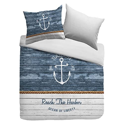 Sognamo Baumwollbettwäsche Skjern 135x200 cm + 80x80 I Reißverschluss I Anker I Maritim I Wendebettwäsche