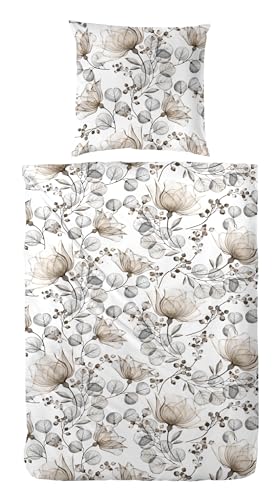 Primera Sempre Mako Satin Bettwäsche 243226 Blumen Grau Sand 135x200 und 80x80 cm100% Baumwolle, Öko Tex 100 zertifiziert