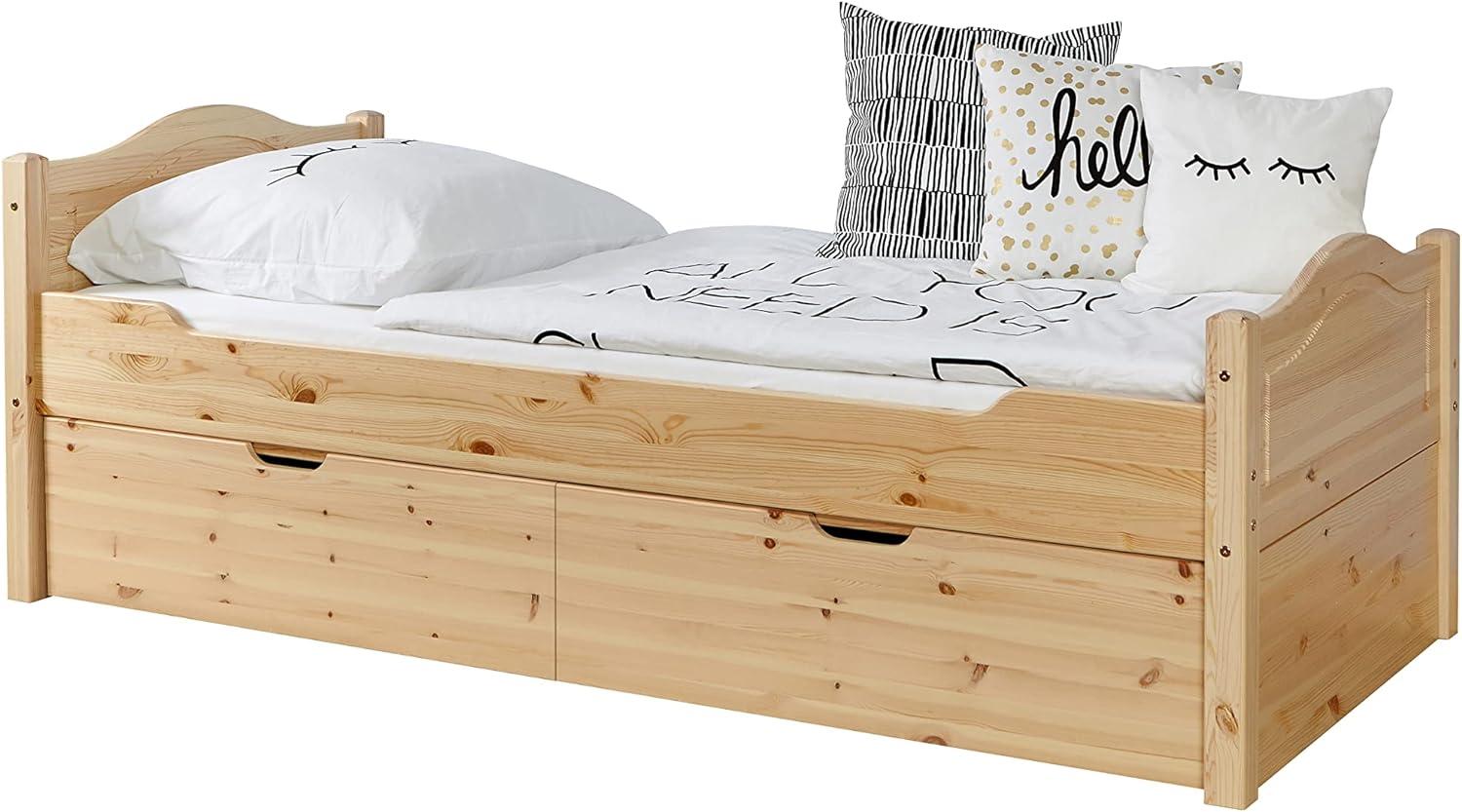 Das Ticaa Einzelbett "Leni" aus massivem Kiefernholz bietet mit einer Liegefläche von 100 x 200 cm eine stilvolle und funktionale Lösung für Ihr Schlafzimmer. Mit zwei praktischen Schubkästen und abgerundeten Kanten vereint es Sicherheit und Stauraum. Die robusten Kopf- und Fußteile sorgen für Stabilität und Langlebigkeit. Ideal für größere Kinder, Jugendliche oder Erwachsene. **Highlights** - Funktionsbett mit 2-er-Schubkästen: Bietet zusätzlichen Stauraum - Hochwertige Verarbeitung: Langlebig und stabil - Liegefläche 100 x 200 cm: Ideal für größere Kinder, Jugendliche oder Erwachsene - Abgerundete Kanten: Für zusätzliche Sicherheit - Zeitloses Design: Passt in jedes moderne Schlafzimmer **Produkteigenschaften** - Abmessungen: Tiefe 211 cm, Breite 109 cm, Höhe 73,5/78 cm - Max. Matratzenhöhe: 25 cm - Material: Kiefer-Massivholz **Lieferumfang** - Einzelbett inkl. 2er-Schubkästen - Montagematerial - Montageanleitung - Ohne Dekoration - Zubehör separat erhältlich - Rollroste für Einzelbett und Zusatzbett - Matratzen für Einzelbett und Zusatzbett