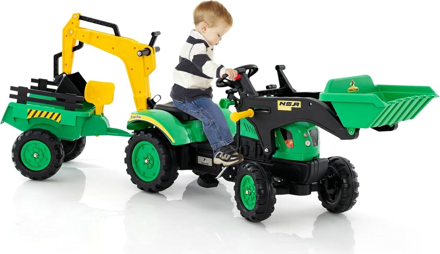 Dreamade Trettraktor Kindertraktor mit Anhänger Schaufel Frontlader Kinderbagger Sitzbagger Hupe Rechen für Kinder ab 3 Jahren (Grün)