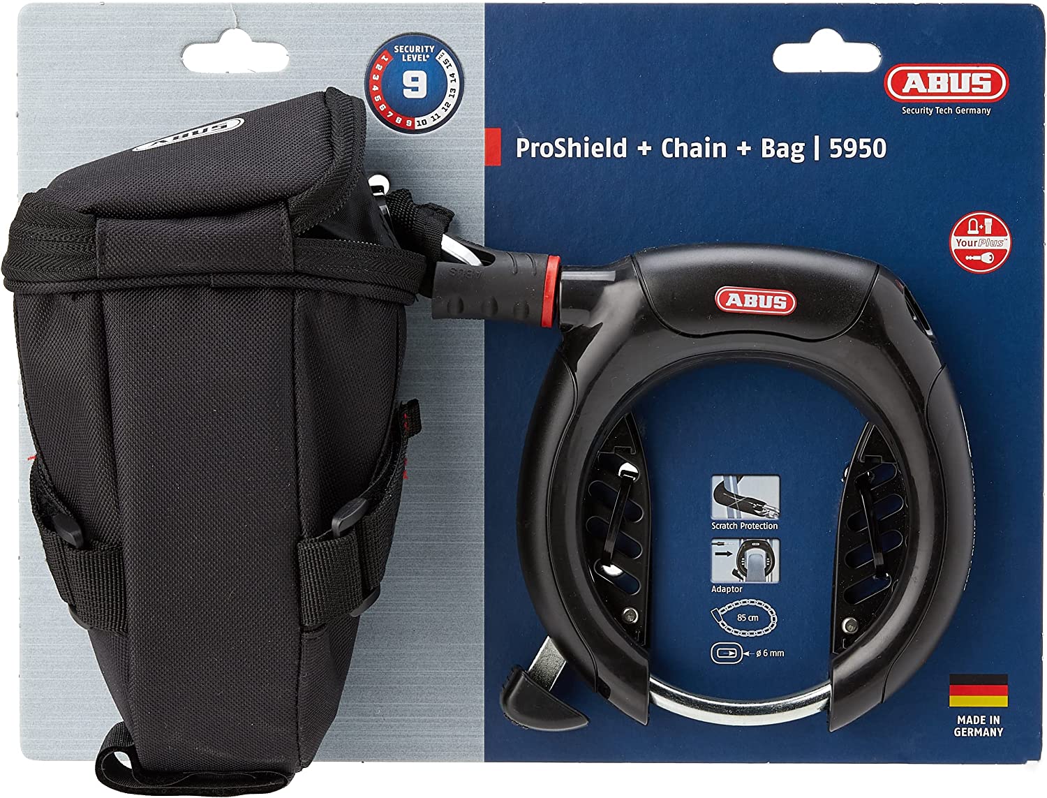 ABUS Pro Shield™ Plus 5950 NR black + 6KS/85 + ST5950 Rahmenschloss Du bist oft mit deinem Rad unterwegs, es liegt Dir Herzen und du hast es hin und wieder eilig? Dann ist es für Dich sicher wichtig, stets ein robustes und schnell schließendes Fahrradschloss zur Hand zu haben. Mit dem ABUS Pro Shield™ Plus 5950 NR black + 6KS/85 + ST5950 Rahmenschloss-Set bist du genau dafür perfekt ausgerüstet. Das Gehäuse, der Bügel und tragende Teile des Verriegelungsmechanismus des ABUS Pro Shield™ Plus 5950 NR black bestehen aus speziell gehärtetem Stahl, der sehr widerstandsfähig ist und auch vor Manipulationen schützt. Nicht umsonst trägt das ABUS Rahmenschloss das Security Level 9. Du steigst vom Rad, legst kurz den 8,5mm starken Verriegelungsbügel um und es kann losgehen. Möchtest du noch mehr Sicherheit, rüstest du das Schloss einfach mit Zubehör auf, indem du eine Rahmenschlosskette in das Schlossgehäuse steckst. Dafür besitzt das Schloss einen weiteren Verschlussmechanismus. In diesem Set erhältst du das Rahmenschloss ABUS Pro Shield™ Plus 5950 NR black zusammen mit der 6KS/85 Kette und der ST5950 Tasche - du bist also mit nur einem Kauf komplett ausgerüstet und brauchst nicht nach passendem Zubehör zu suchen! Komfort- und Sicherheitsmerkmale des ABUS Pro Shield™ Plus 5950 NR black + 6KS/85 + ST5950 Security Bike Level 9 Komplett-Set Einfache Handhabung Mit Zubehör erweiterbar Praktische Klapptechnik Gehärteter Stahl Kompakt und schnell schließend Stabilität und Flexibilität