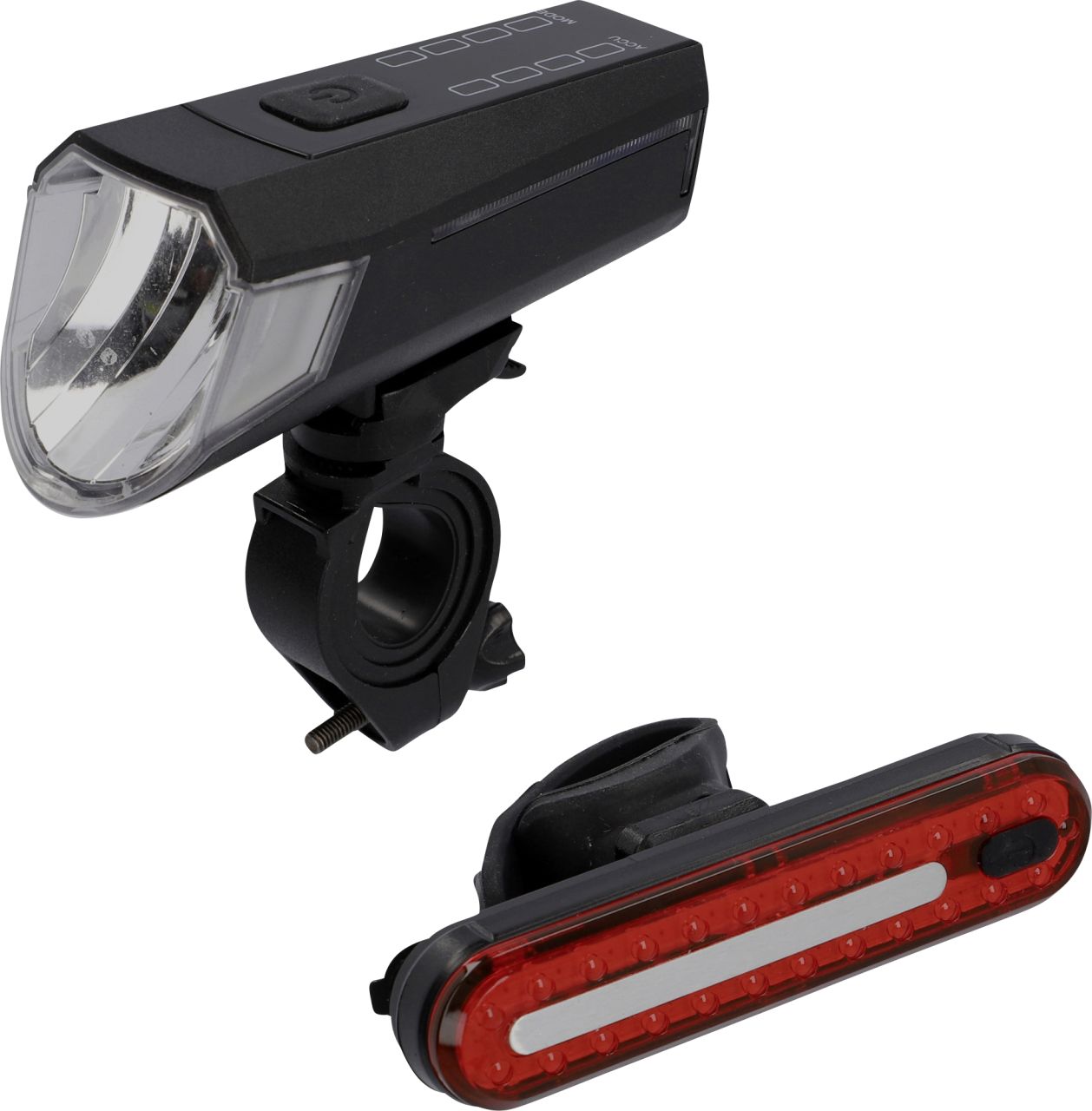 Das Fahrrad Beleuchtungsset mit Akkus von Fischer besteht aus Front- und Rückleuchte. Dank der Universalhalterung mit Schnellverschluss lassen sich die Lampen einfach an jedem Fahrrad anbringen. Werkzeug wird dafür nicht benötigt, ebenso wenig wie für die Befestigung der Lampe an der Halterung. An der Frontlampe ist eine Ladestandanzeige integriert. Hier zeigen 4 LE Ds jederzeit den momentanen Akkustand leicht verständlich an. Für die Frontlampe stehen 4 verschiedene Modi zur Auswahl bereit. Die Beleuchtungsstärke lässt sich so zwischen 80, 40 und 20 Lux wählen. Mit dem Sensormodus steht zusätzlich eine intelligente Funktion zur Verfügung. Hierbei passt die Frontlampe die Intensität automatisch entsprechend den Lichtverhältnissen an. Weiterhin verfügt die Rückleuchte über eine Stopp-Licht-Funktion. Wird die Bremse betätigt, leuchten alle 50 LE Ds der Rückleuchte auf. Bei der normalen Fahrt sind hingegen nur 25 LE Ds aktiv. Somit erkennen die Verkehrsteilnehmer, dass ein Fahrrad bremst. Beide Lampen im Fahrrad Beleuchtungsset mit Akkus von Fischer verfügen über spritzwassergeschützte Gehäuse der Klasse IP44. Damit sind die Fahrradleuchten von allen Seiten vor eindringender Feuchtigkeit durch Regen oder andere Formen von Spritzwasser geschützt. Beide Lampen verfügen über fest eingebaute Li-Ionen Akkus. Mit einer maximalen Laufzeit von 22 Stunden bietet die Frontleuchte eine sehr hohe Kapazität. Bei der Rückleuchte liegt die Akkulaufzeit bei bis zu 12 Stunden. Innerhalb von 5 Stunden lässt sich der Akku der Frontleuchte per USB vollständig aufladen. Bei der Rückleuchte nimmt der Ladevorgang nur 3 Stunden in Anspruch. Dafür wird ein Mirco-USB-Ladekabel benötigt. Dieses Kabel ist Teil des Lieferumfangs. bis 80 Lux, umschaltbar auf 40 Lux/20 Lux/Sensormodus einfache werkzeuglose Montage, Universalhalterung mit Schnellverschluss Rückleuchte mit Stopp-Licht-Funktion 4 LE Ds für Batteriestände und 4 LE Ds für Betriebszustände Frontleuchte: Leuchtdauer bis zu 22 Stunden Frontleuchte: Spritzwassergeschütztes Gehäuse nach IPX4 Standard Rückleuchte: Leuchtdauer bis zu 12 Stunden Rückleuchte: Spritzwassergeschütztes Gehäuse nach IPX4 Standard Frontleuchte: Abmessung: 43 x 105 x 43 mm Rückleuchte: Abmessung: 22 x 23 x 96 mm einfache werkzeuglose Montage, Universalhalterung mit Schnellverschluss Lieferumfang: Beleuchtungsset inklusive Mirco-USB-Ladekabel