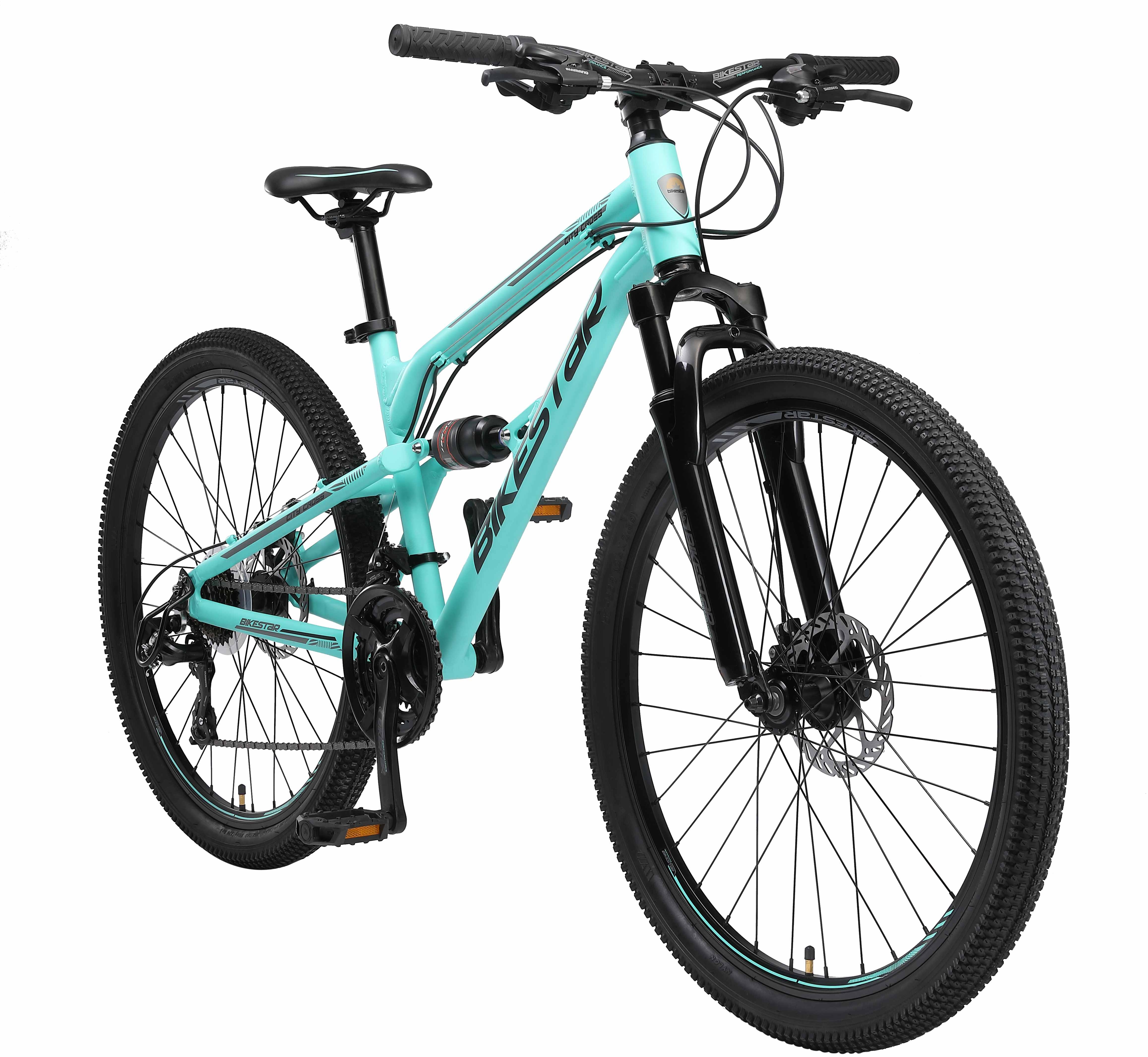 | Name | BIKESTAR Vollgefedert Aluminium Mountainbike 26 Zoll, 21 Gang Shimano Schaltung mit Scheibenbremse, 16 Zoll Rahmen Fully MTB Erwachsenen- und Jugendfahrrad, Türkis |