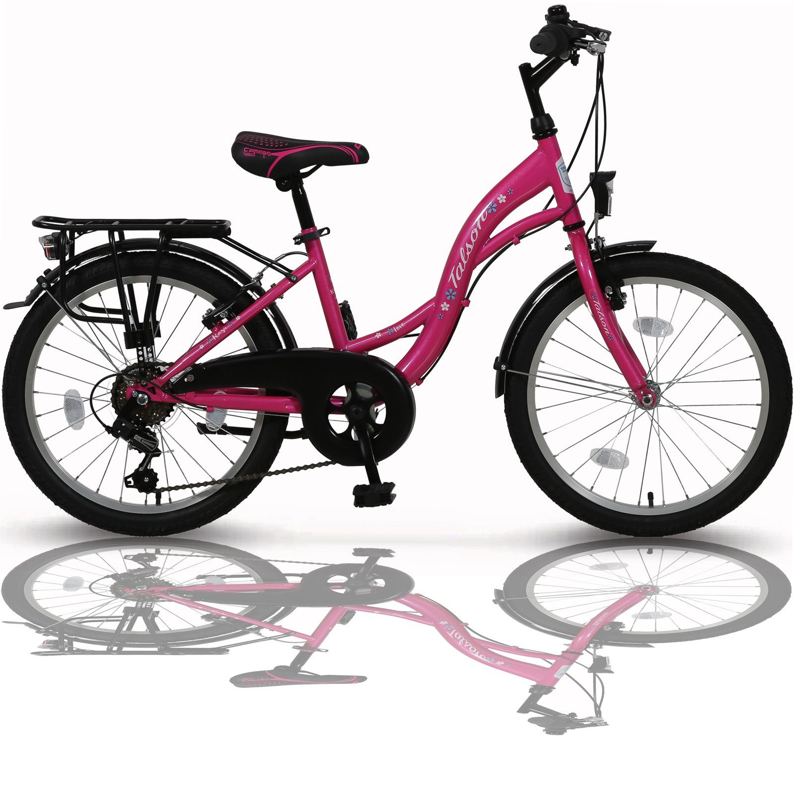 Talson Kinderfahrrad 20 Zoll Cityrad6 Gang Shimano, Kettenschaltung, mit Beleuchtung nach StVZO und Gepäckträger Rosa