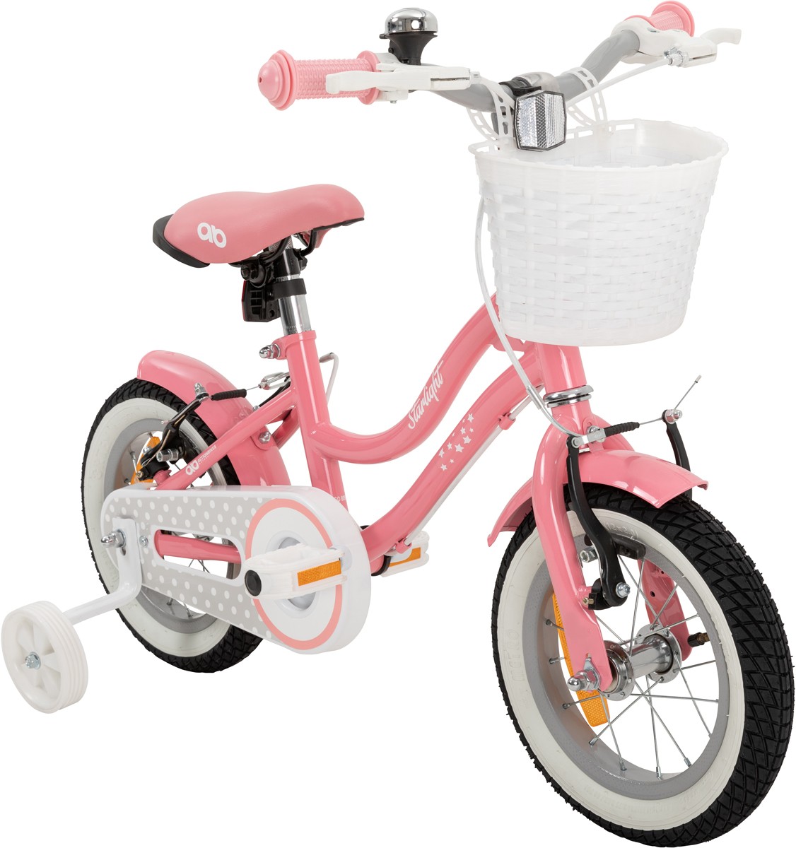 Mit dem Kinderfahrrad Starlight 12 Zoll nach den Sternen greifen. Wer kennt es nicht? Einer der größten Wünsche unserer Kleinsten: ein neues Fahrrad! Aber Kinderrad ist nicht gleich Kinderrad. Entscheiden Sie sich für das 12-Zoll-Kinderfahrrad Starlight und bringen Sie die Augen Ihres Sprösslings zum Leuchten! Denn dieses Mädchen-Fahrrad überzeugt mit einem zauberhaften Design und lässt Ihr Kind mit Sicherheit stolz losradeln. Aber nicht nur das Äußere weiß zu überzeugen: Das Kinderfahrrad punktet auch mit allerlei Zubehör für ein sicheres Fahren. Ein Kettenschutz, Schutzbleche, Stützräder, Antirutschgriffe, eine Klingel, Katzenaugen und Reflektoren sind inklusive! Spezielle Felgenbremsen stoppen das Kinderrad zuverlässig. Kleine Details wie ein Fahrradkorb runden das Komplettpaket ab. Mit seiner Luftbereifung von 12 Zoll eignet sich das Fahrrad ideal für Kids im Alter von 2-5 Jahren. Lassen Sie Ihren Nachwuchs mit dem neuen 12-Zoll-Kinderfahrrad Starlight nach den Sternen greifen! Einfach himmlisch! Ein Traum in Pastellrosa. Das Auge fährt mit! Eins ist also klar, wenn Sie ein Kinderfahrrad kaufen: Gefallen muss es den kleinen Radlern! Das 12-Zoll-Kinderfahrrad Starlight kommt in einem verspielten Pastellrosa daher. Details wie die grauen Speichen und Felgen oder die weißen Punkte auf dem Kettenschutz fügen sich harmonisch ins stimmige Gesamtbild ein. Der Schriftzug „Starlight“ in Verbindung mit kleinen weißen Sternen vollendet das himmlische Design des Mädchen-Fahrrads. Fest im Sattel wie die Großen Auf dem Kinderrad für die Kleinen. Die Fahrradgröße ist wohl die wichtigste Voraussetzung für eine sichere Fahrt. Ein Kinderfahrrad 12 Zoll empfiehlt sich ab einer Körpergröße von 95 cm. Und das Beste: Dank verstellbarer Lenker-und Sitzhöhe bereitet es lange Freude! Variieren Sie die Höhe des Sitzes je nach Bedarf zwischen 46 cm und 50 cm. Ebenfalls perfekt für die Kleinen: Der Schwanenhals-Rahmen! Denn dieser ermöglicht durch den tiefen Einstieg besonders leichtes Aufsteigen. So tritt der kleine Radler stets ausbalanciert in die Pedale des Kinderfahrrads. Alle guten Dinge sind. Im Fahrradkorb dabei. Eine kurze Spritztour oder eine längere Fahrradtour gefällig? Dank des Fahrradkorbs sind auch die Kleinsten schon perfekt gerüstet! So ist der Lieblings-Teddy oder die Puppe immer mit dabei. Oder auch eine kleine Brotzeit, Mütze, Jacke und Co. finden auf dem Fahrrad Platz. Der Fahrradkorb wird nicht gebraucht? Auch kein Problem: Den Korb bringen Sie mit wenigen Handgriffen am Kinderfahrrad an oder nehmen ihn wieder ab. Ganz ohne Funkenschlag Mit Felgenbremsen sanft stoppen. Das Fahrradfahren bedeutet für unsere Kleinsten einen großen Schritt in Richtung Selbstständigkeit. Denn nun nimmt das Kind das Steuer selbst in die Hand. Wichtig dabei: Im richtigen Moment entschleunigen und passgenau zum Stehen kommen. Dafür sorgen bei diesem 12-Zoll-Kinderfahrrad effektive Caliper-Bremsen. Diese Felgenbremsen ermöglichen sanftes Stoppen. Ein Zug am Bremshebel genügt und schon werden die Bremsklötze gegen die Reifen gedrückt. Die Folge: Das Kinderfahrrad hält behutsam und trotzdem zuverlässig an. Es ist noch kein Meister vom Himmel gefallen! Kinderfahrrad mit Stützrädern als Einstieg. Gerade zu Beginn erfordert das Fahrradfahren eine große Portion Eifer und Geduld. Damit die Motivation hoch bleibt, erleichtert ein Kinderfahrrad mit Stützrädern den Einstieg. So können die Kleinen leichter die Balance halten und sich voll und ganz auf ihre Umgebung, das Treten, Lenken und Bremsen konzentrieren. Bereit für den nächsten Schritt? Nehmen Sie die Stützräder im Handumdrehen ab. Nun radelt Ihr Sprössling auf seinem 12-Zoll-Kinderfahrrad Starlight stolz und ohne Hilfe auf und davon. Unter einem guten Stern unterwegs Dank Antirutschgriffen, Kettenschutz uvm. Sicherheit wird bei diesem Kinderfahrrad von Actionbikes großgeschrieben! Ein Kettenschutz hält flatternde Kleidung von der Mechanik fern. Antirutschgriffe sorgen für einen festen Griff. Und Schutzbleche vorne und hinten wehren aufgewirbelte Steinchen und Schmutz ab. Auch die bestmögliche Wahrnehmung ist gegeben. Denn auf dem Kinderfahrrad Starlight ist der Fahrer mit funkelnden Augen und leuchtenden Reflektoren unterwegs: Katzenaugen in den Speichen und Reflektoren vorne, hinten und an den Pedalen sorgen für die nötige Aufmerksamkeit. Und mit der Klingel verschaffen sich die Kids stets freie Bahn. **Technische Daten Produkthighlights:** - Caliper Bremse vorne und hinten - Schutzbleche vorne und hinten - inkl. Korb **Sicherheit:** - Caliper Bremse vorne und hinten - Reflektoren - Stützräder - Kettenschutz - Klingel am Lenker - Lenkerhöhe: 62. 0 cm - Lenkerbreite: 51. 0 cm - Sitzhöhe: Höhenverstellbar 46. 0 - 50. 0 cm - Produktmaße (L X B X H): 86. 0 x 51. 0 x 65. 0 cm - Empfohlene Körpergröße: ab 95 cm - Produktgewicht(E): 9. 0 kg - Kartongewicht(E): 10. 40 kg - Kartonmaße (L X B X H): 75. 0 x 20. 0 x 38. 50 cm - Sitz (L X B X H): 21. 0 x 13. 0 x 6. 5 cm - Laufradgröße: 12 Zoll **Zubehör:** - Schutzblech vorne und hinten - Korb - Klingel - Schutzblech: vorne und hinten - Tretlagerhöhe: 16. 0 cm - Kettenschutz: geschlossener Kettenschutz - Bremsen: Caliper Bremse **Weitere Funktionen:** - Antirutschgriffe am Lenker, - mit Freilauf - Max. Zuladung: 35. 0 kg - Reifen: Luftbereifung 12 Zoll, 2. 7 Bar - Empfohlenes Alter: 2 - 5 Jahre